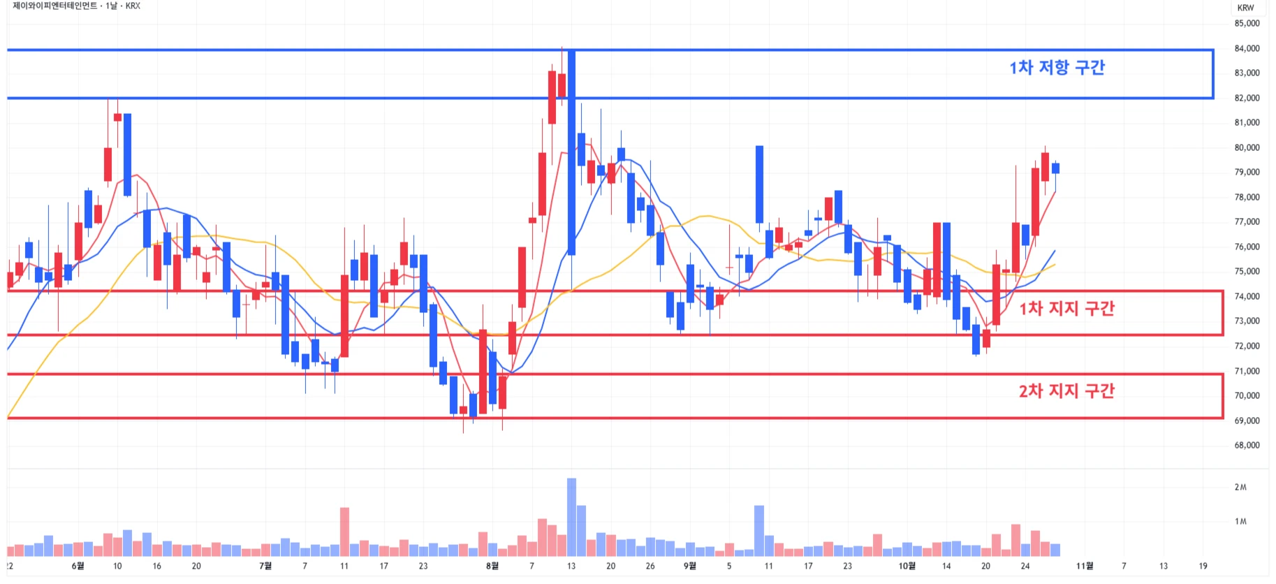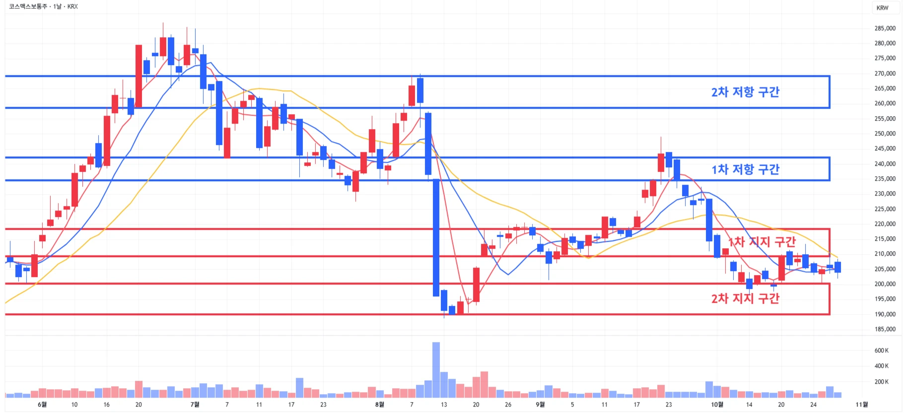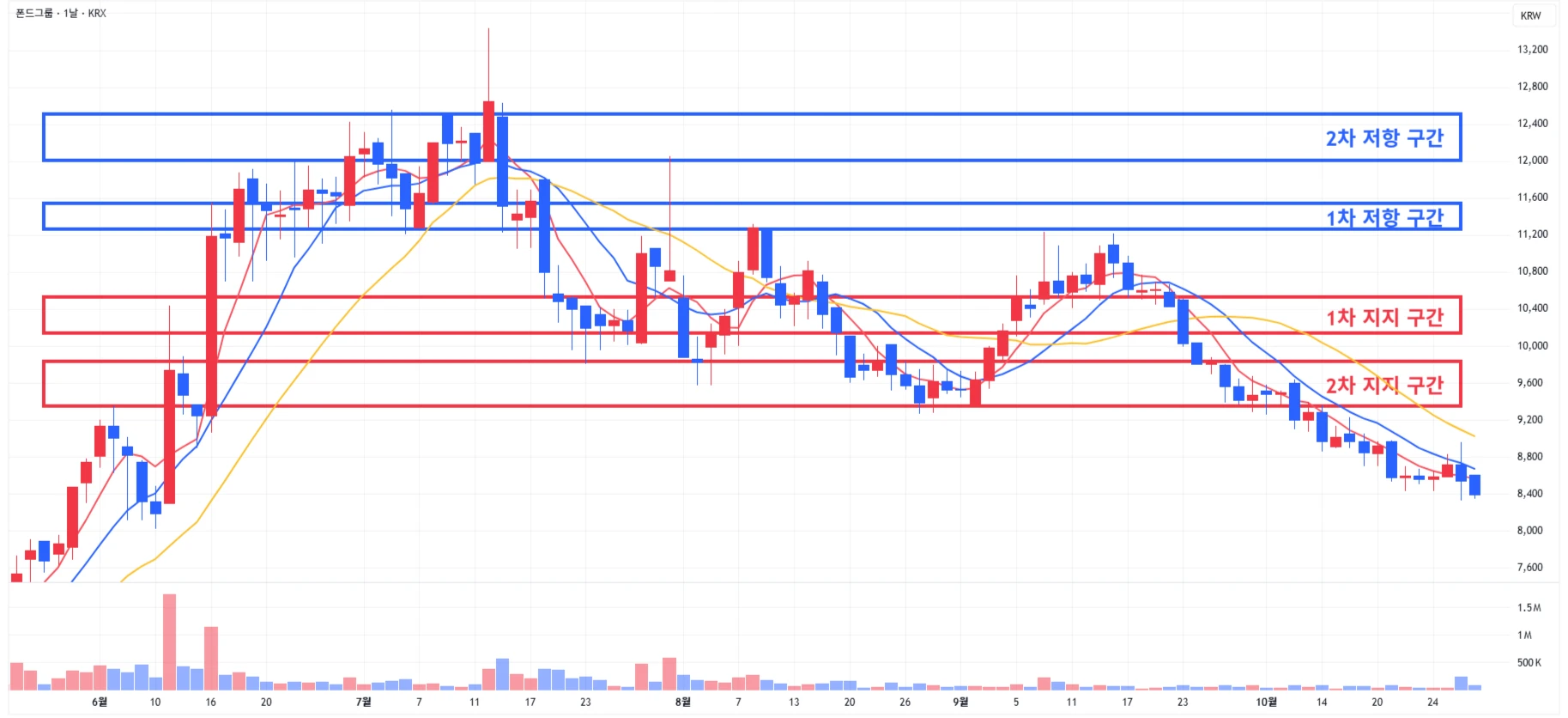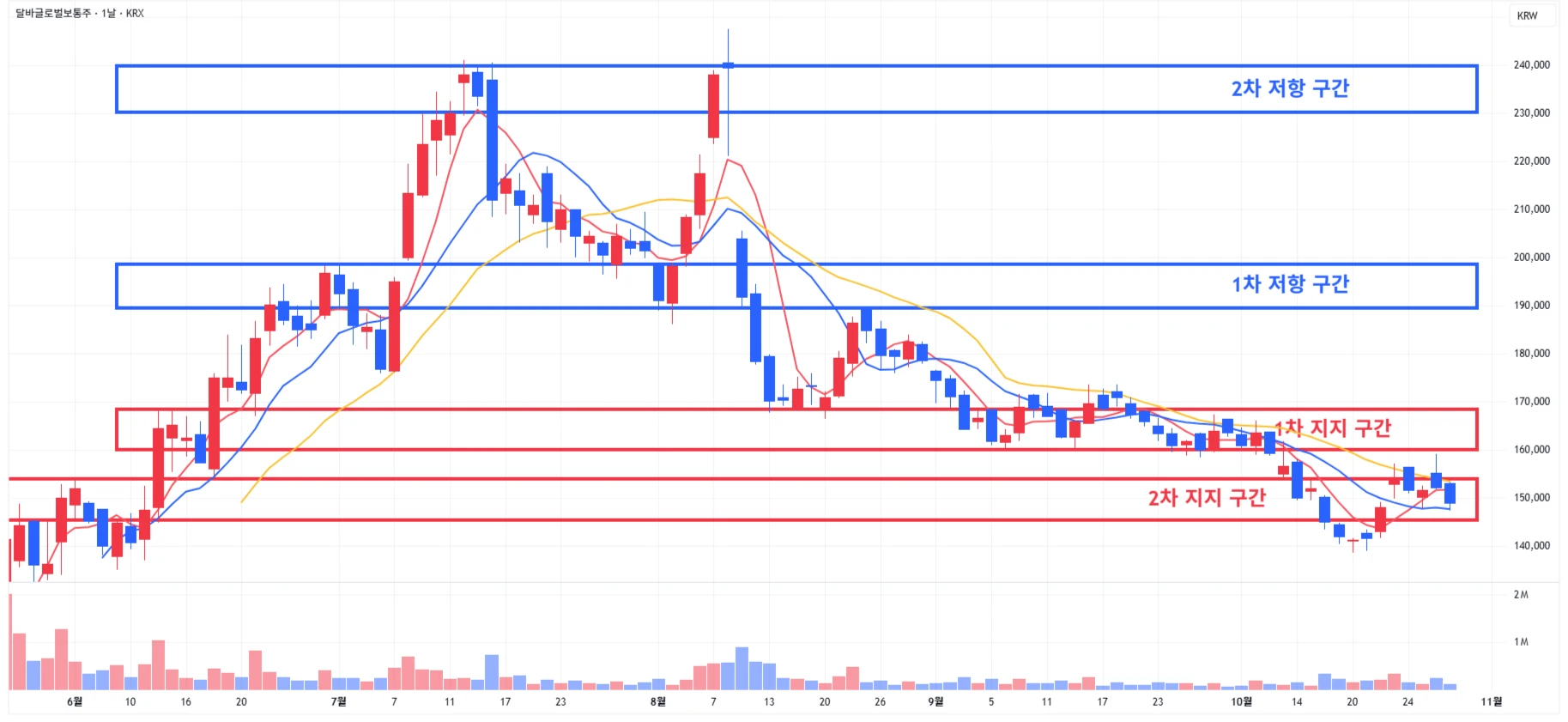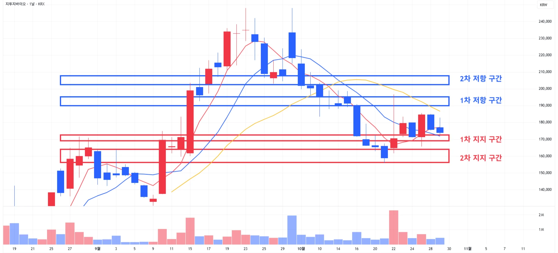 1차 지지 구간 하단 이탈 시에는 일부 물량 손절 후, 2차 지지 구간 도달 시 분할 매수 진행