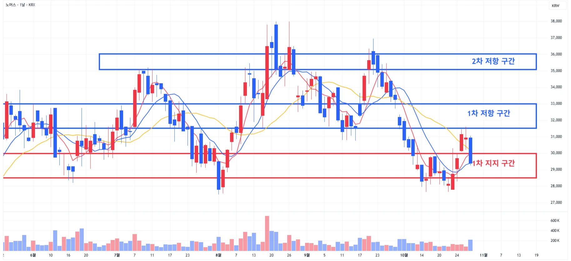 2) 노머스 : 당일 기관의 대량 매도가 발생하며, 다시 1차 지지 구간 상단 밑으로 하락 후 마무리
