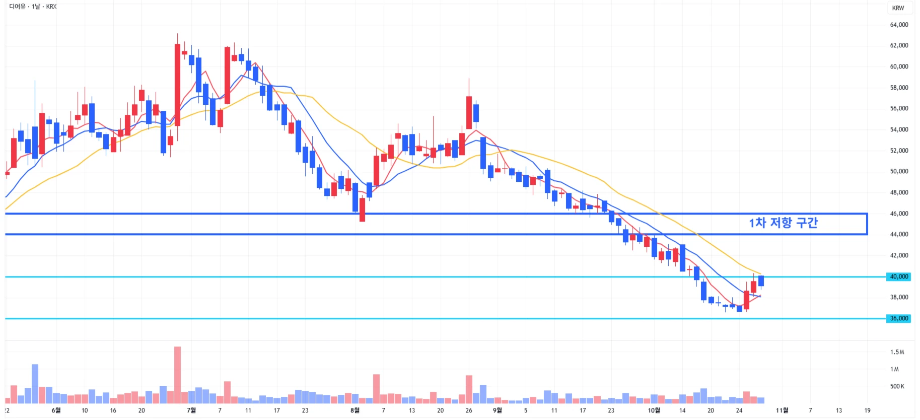 3) 디어유 : 4만원 구간에 저항이 발생하며, 당일 하락 마무리