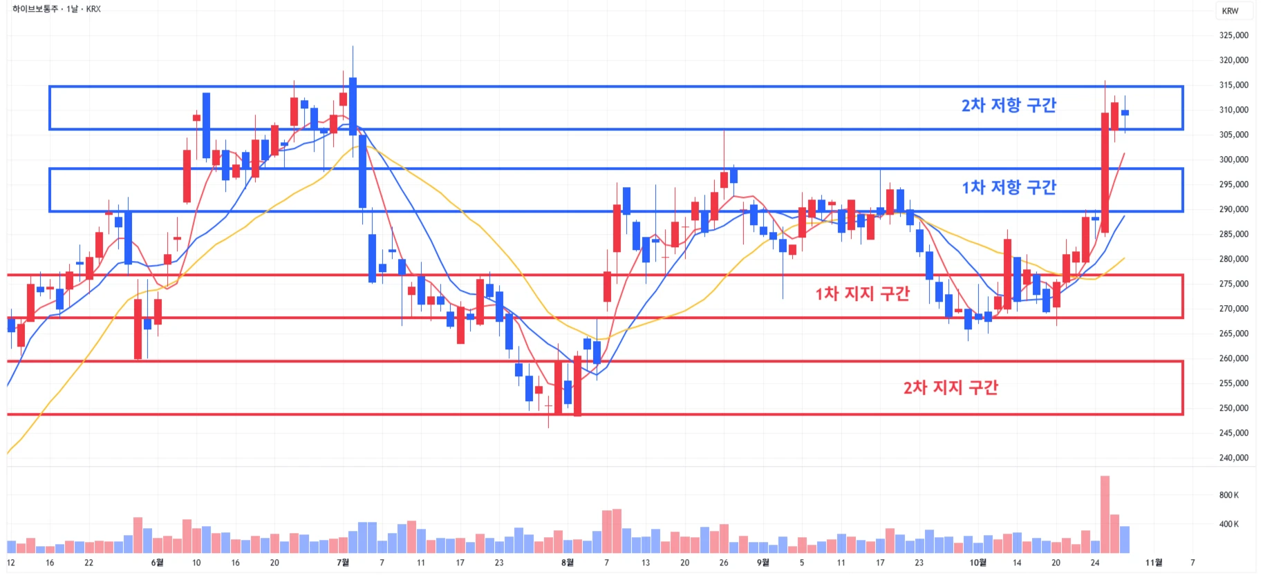 4) 하이브 : 당일 섹터 전반적 약세에, 소폭 하락 마무리