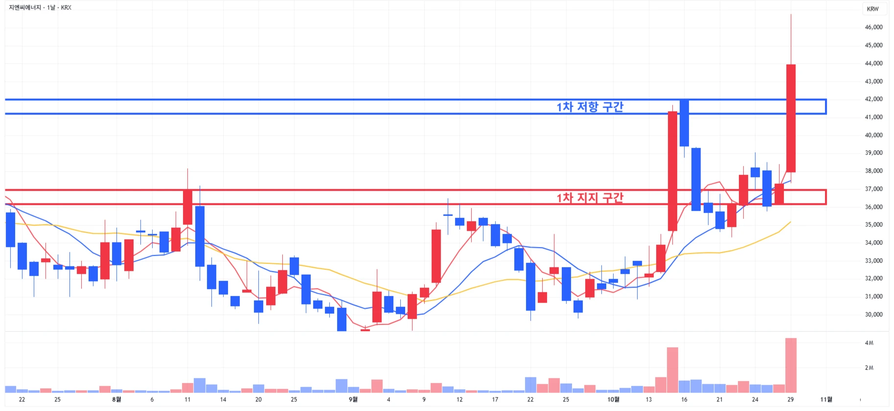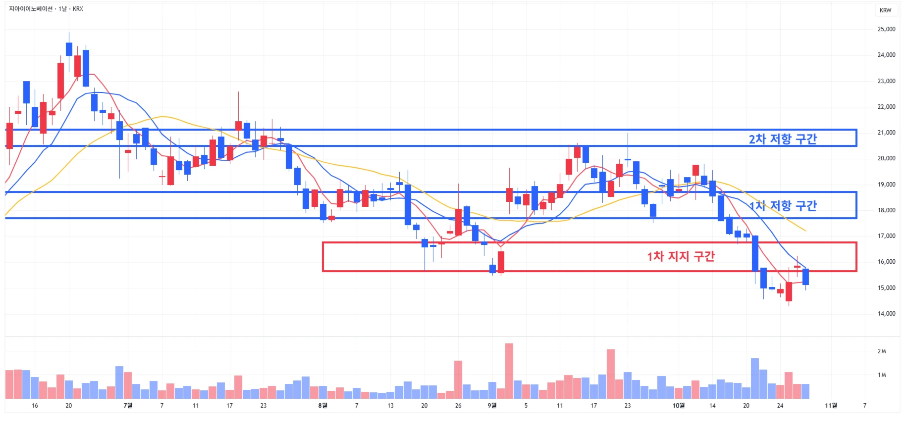 1) 지아이이노베이션 : 당일 섹터 전반적 약세에 다시 1차 지지 구간 하단 아래로 이탈