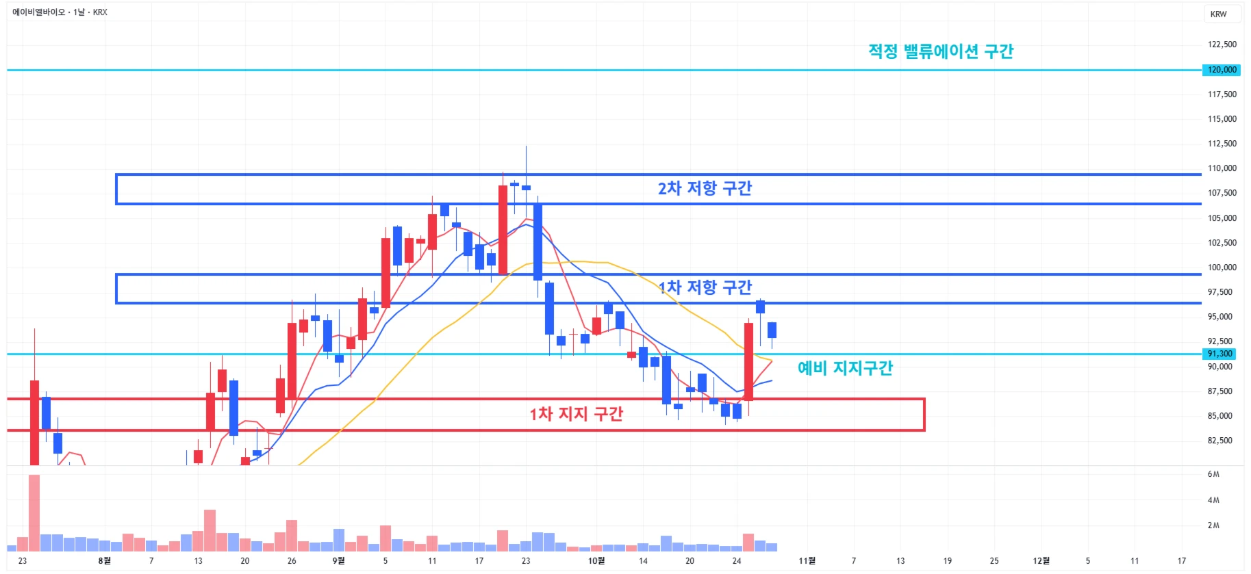 2) 에이비엘바이오 : 당일 섹터 전반적 약세에, 당일 하락 마무리