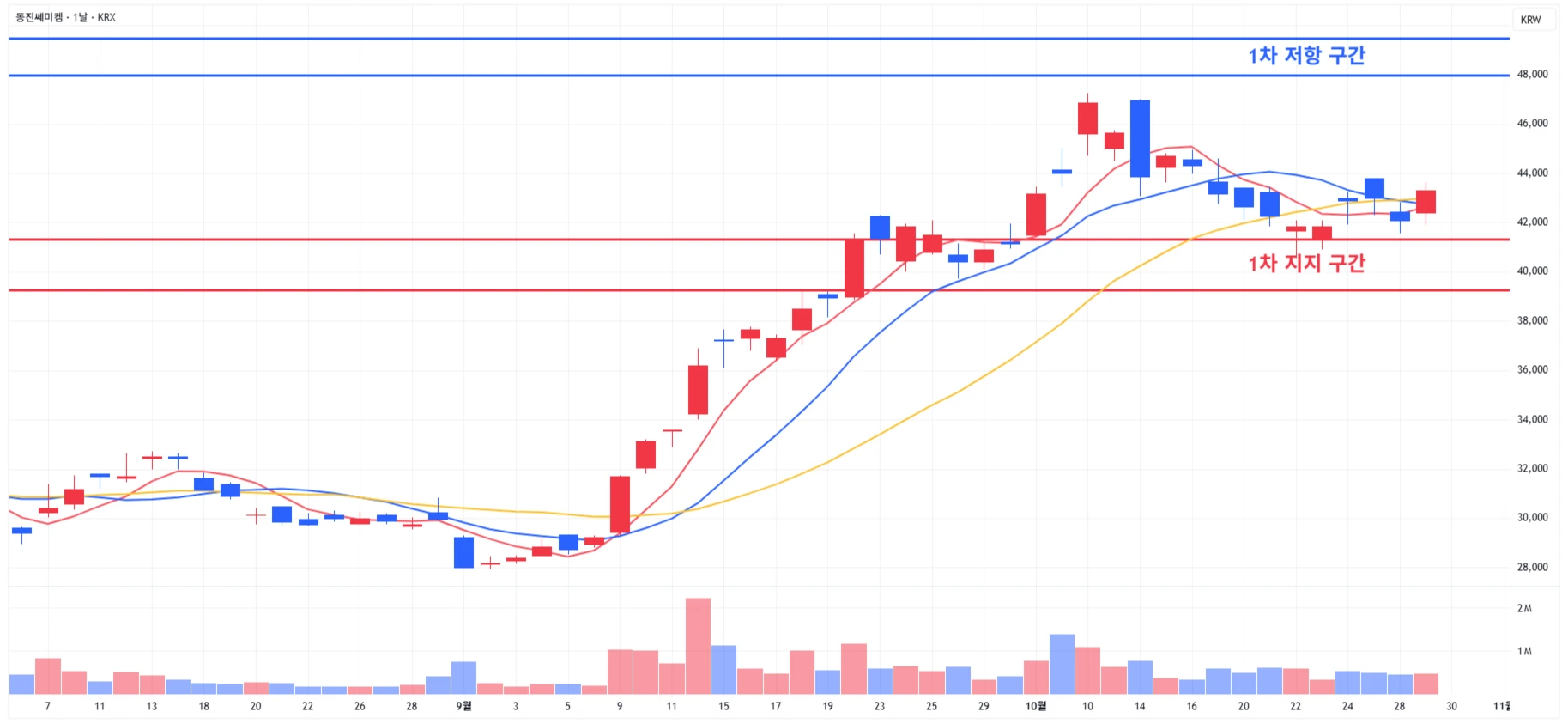 1) 동진쎄미켐 : 당일 섹터 전반적 강세에, 1차 지지 구간 상단에서 반등 후 마무리