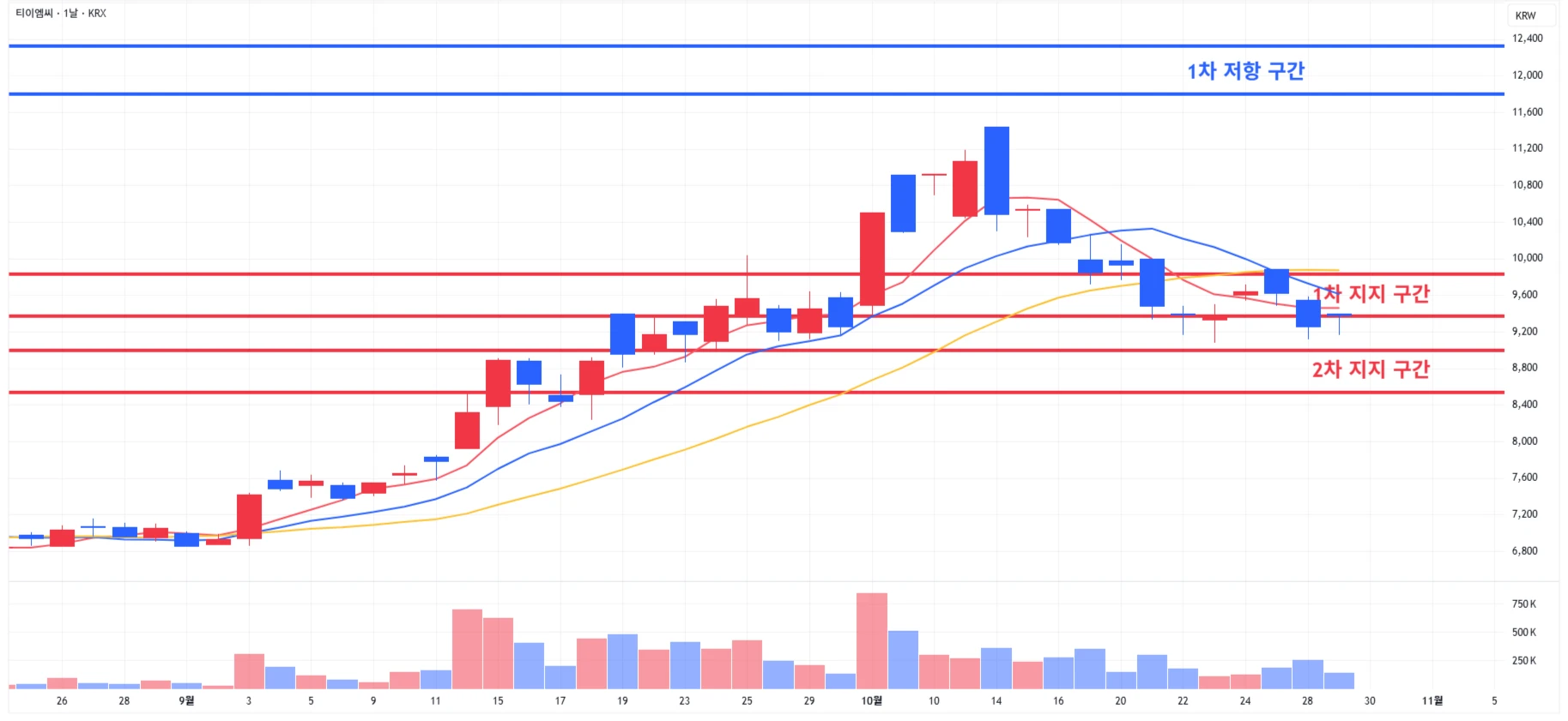 2) 티이엠씨 : 큰 변동성 없이 1차 지지 구간 하단에서 마무리
