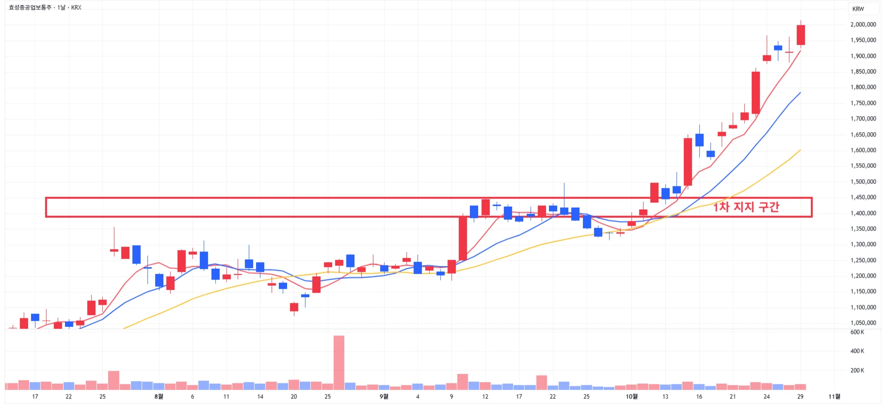 1) 1차 지지 구간 도달 시 분할 매수 진행