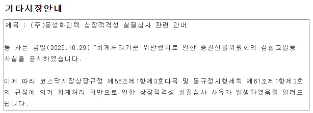 동성화인텍/회계처리기준위반행위로인한증권선물위원회의검찰고발등/2025.10.29