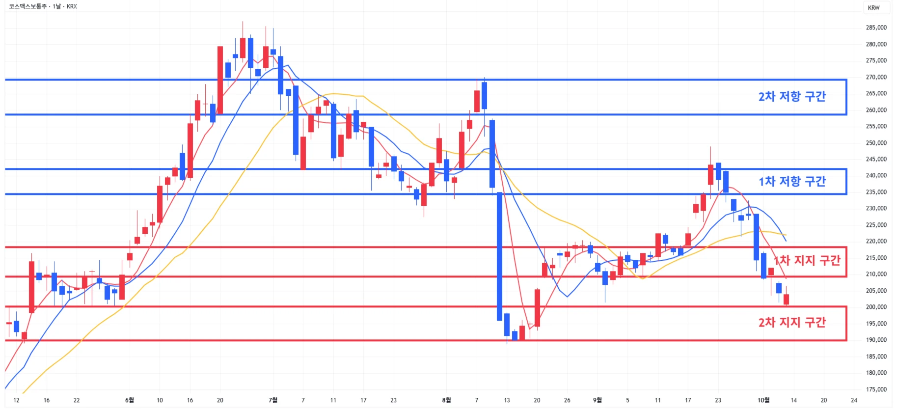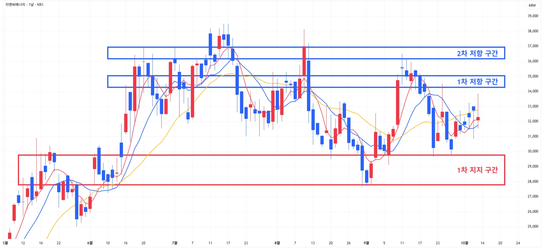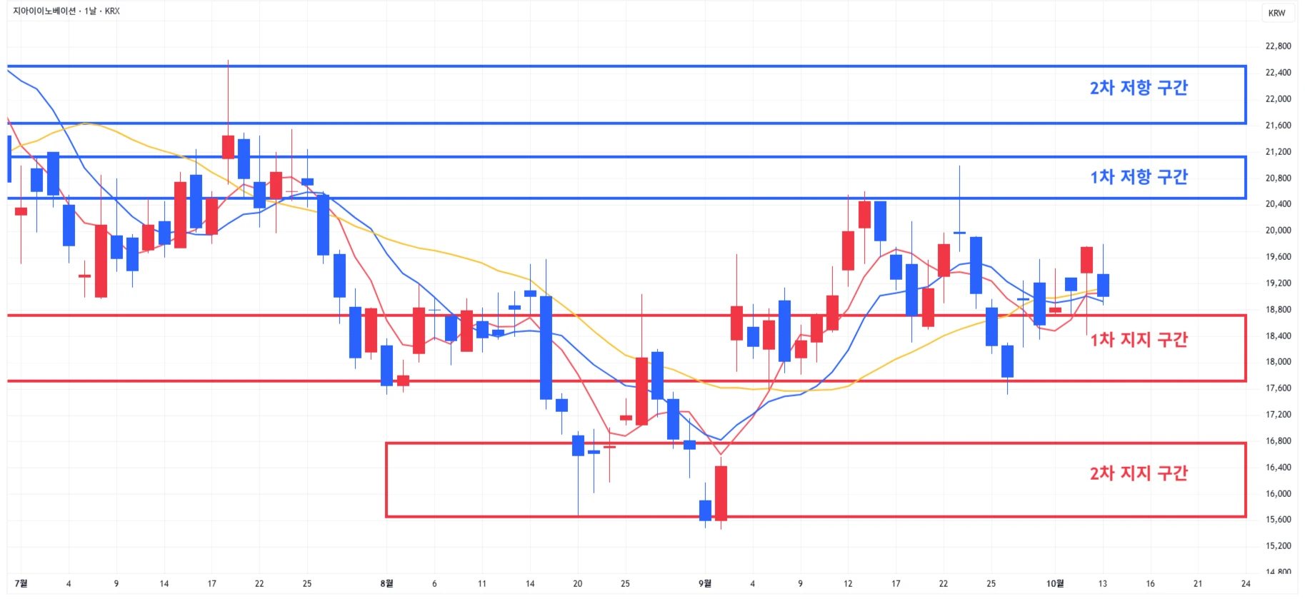 → 매수 시나리오 예시) * 10월 17일 ~ 21일 유럽종양학회에서 'GI-102' 단독요법, 키트루다 병용요법 1·2상 연구 데이터 발표 계획 1) 1차 지지 구간 내 분할 매수 진행 2) 1차 지지 구간 하단 이탈 시에는 일부 물량 손절 후, 2차 지지 구간 도달 시 분할 매수 진행