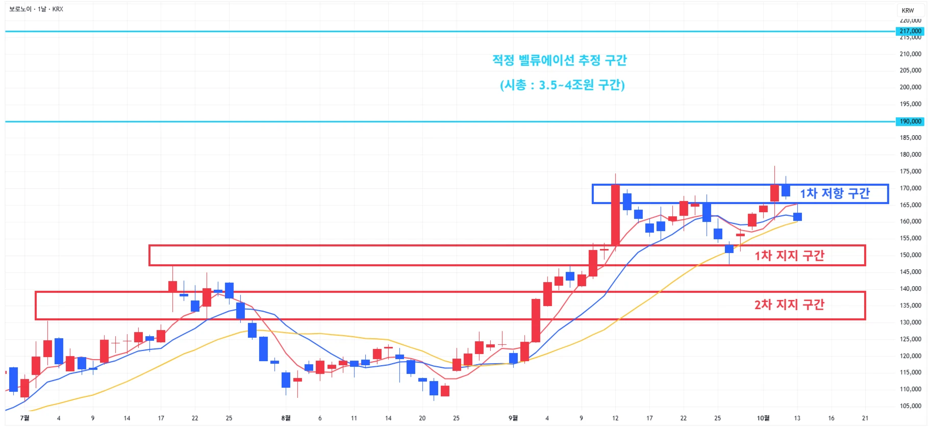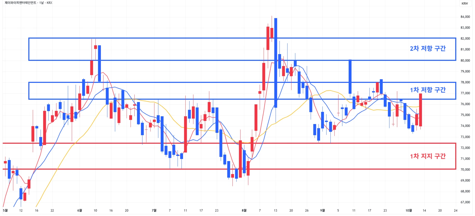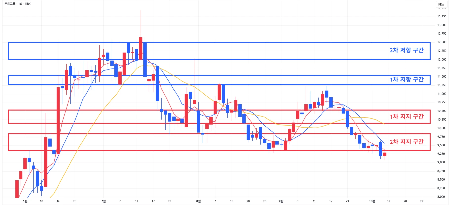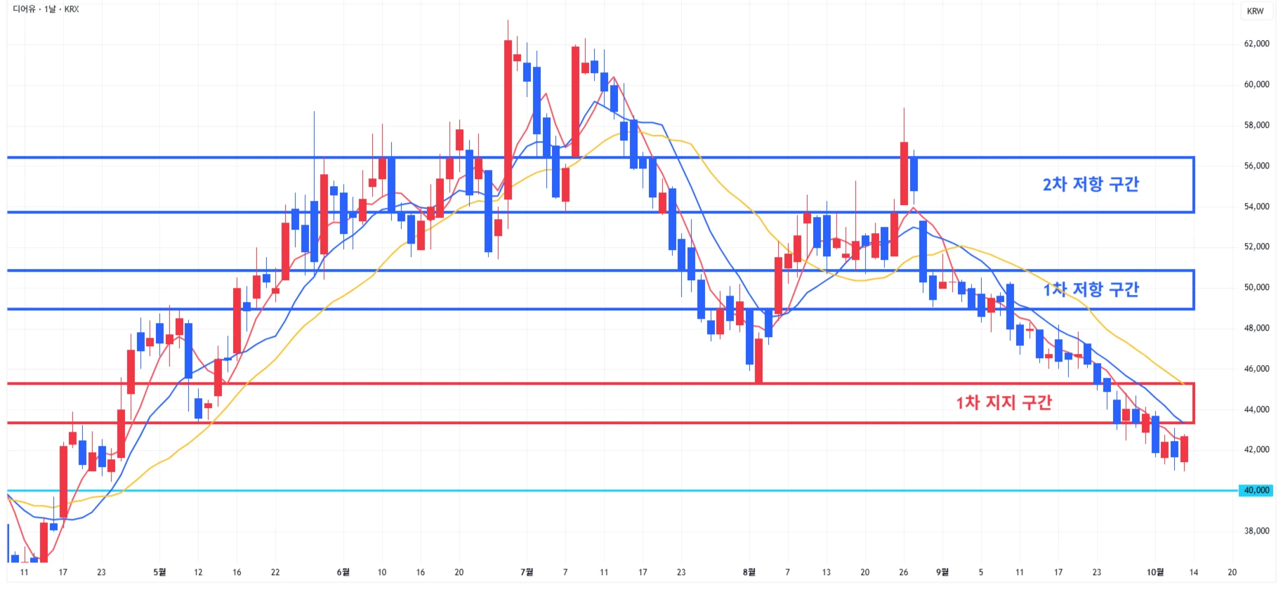 → 매수 시나리오 예시) * 10월 17일 ~ 21일 유럽종양학회에서 'GI-102' 단독요법, 키트루다 병용요법 1·2상 연구 데이터 발표 계획 1) 1차 지지 구간 내 분할 매수 진행 2) 1차 지지 구간 하단 이탈 시에는 일부 물량 손절 후, 2차 지지 구간 도달 시 분할 매수 진행