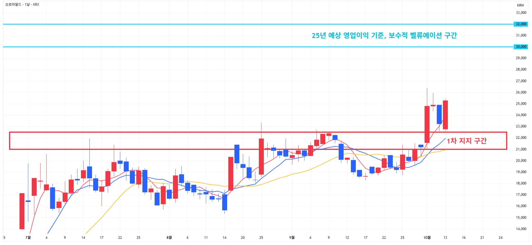 5) 오로라 : 당일 1차 지지 구간 상단에서 강한 반등이 발생하며 전고점 근처에서 마무리