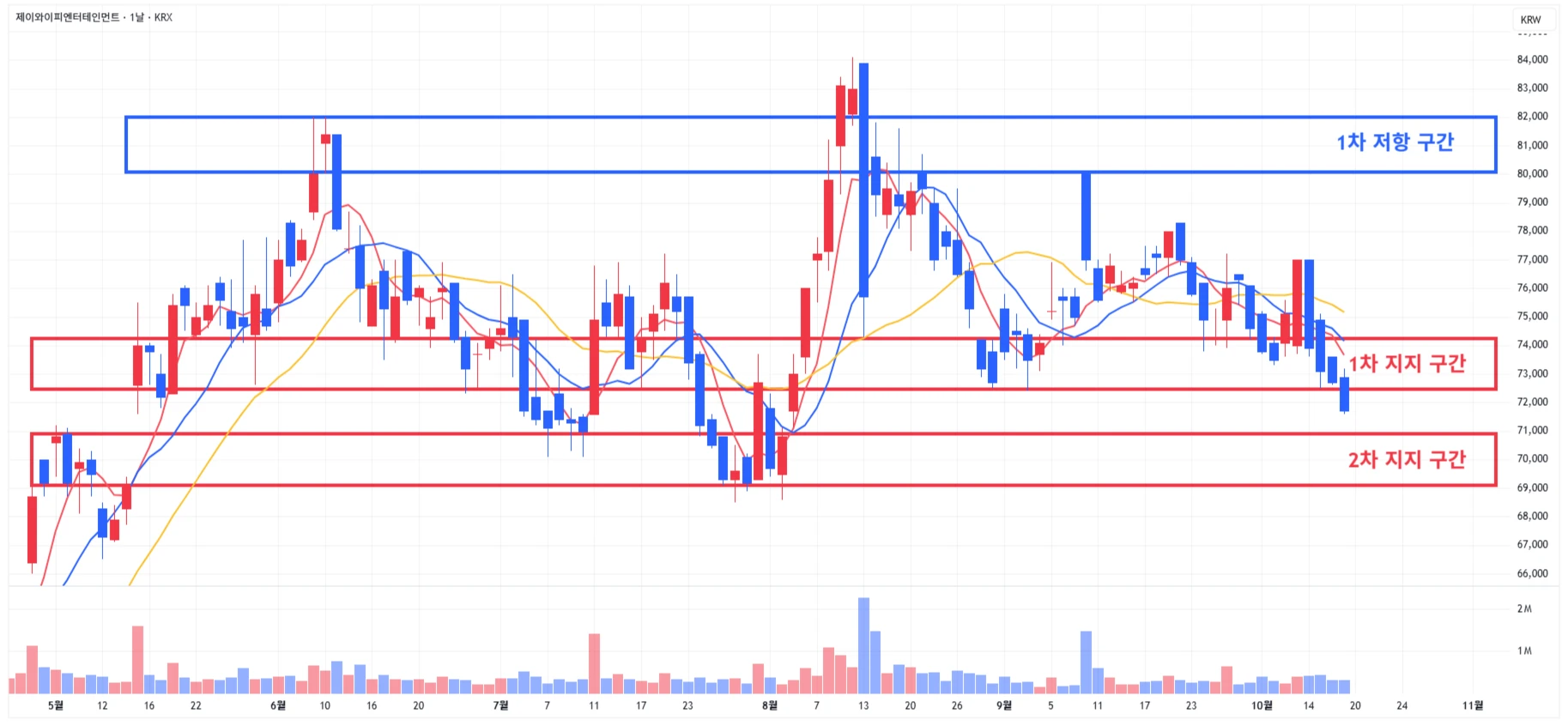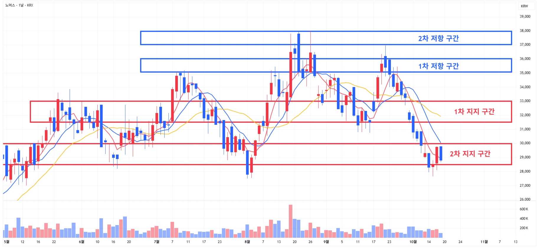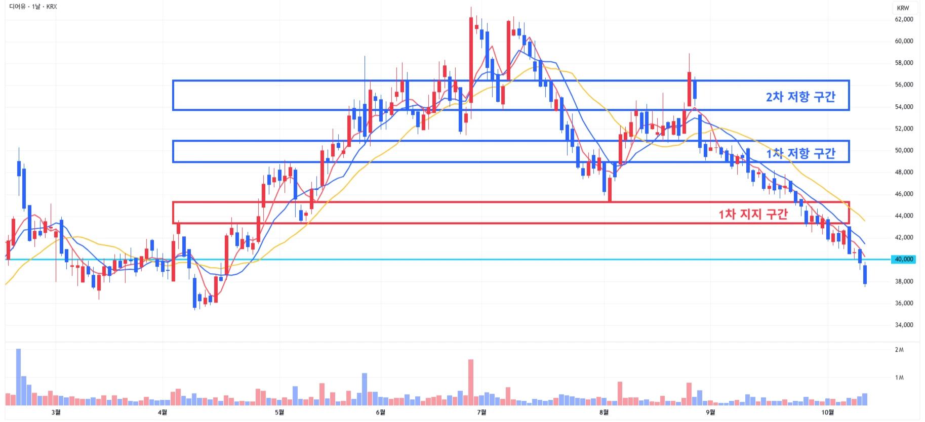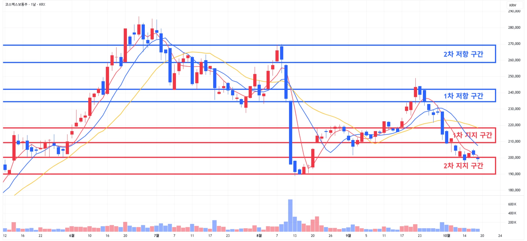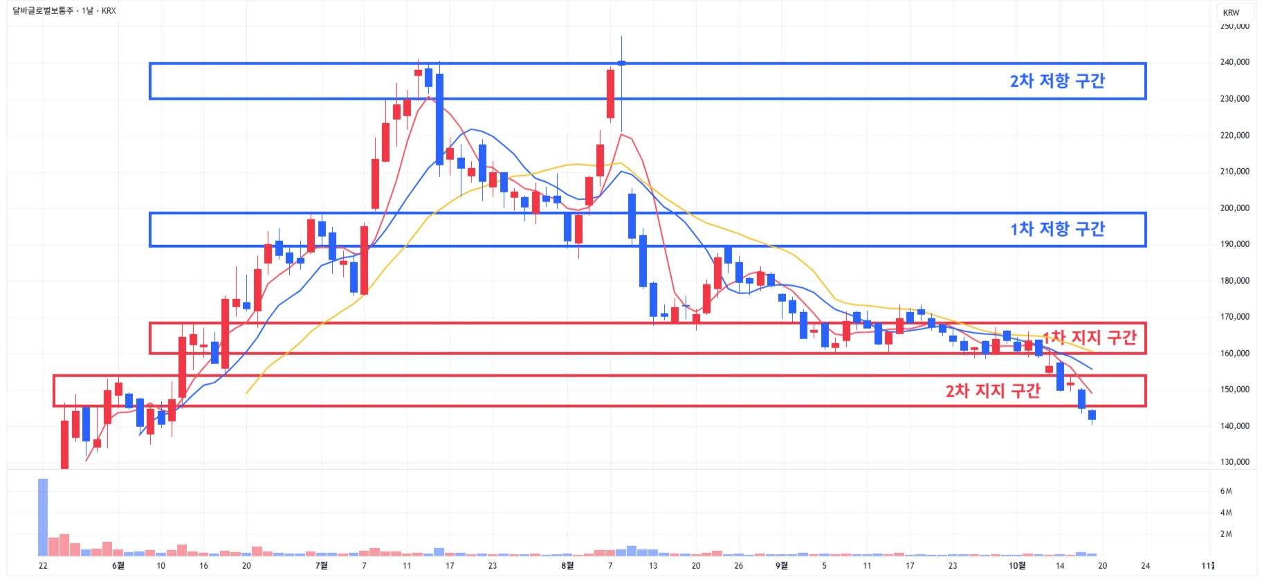 → 매수 시나리오 예시) 1) 1차 지지 구간 내 분할 매수 진행 2) 1차 지지 구간 하단 이탈 시에는 일부 물량 손절 후, 2차 지지 구간 도달 시 분할 매수 진행