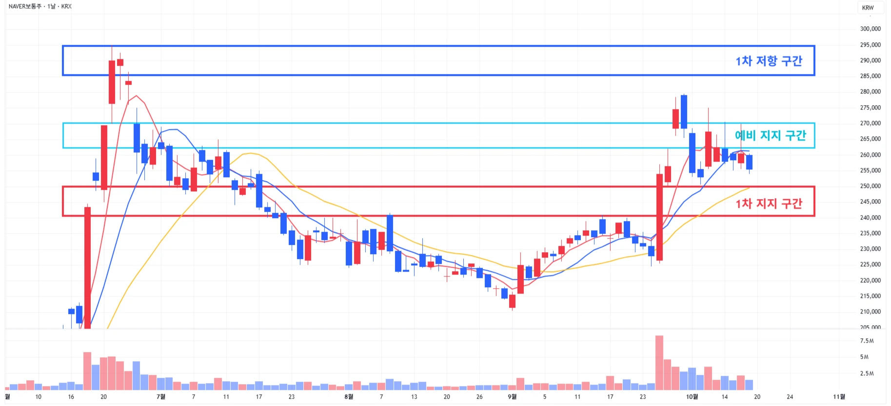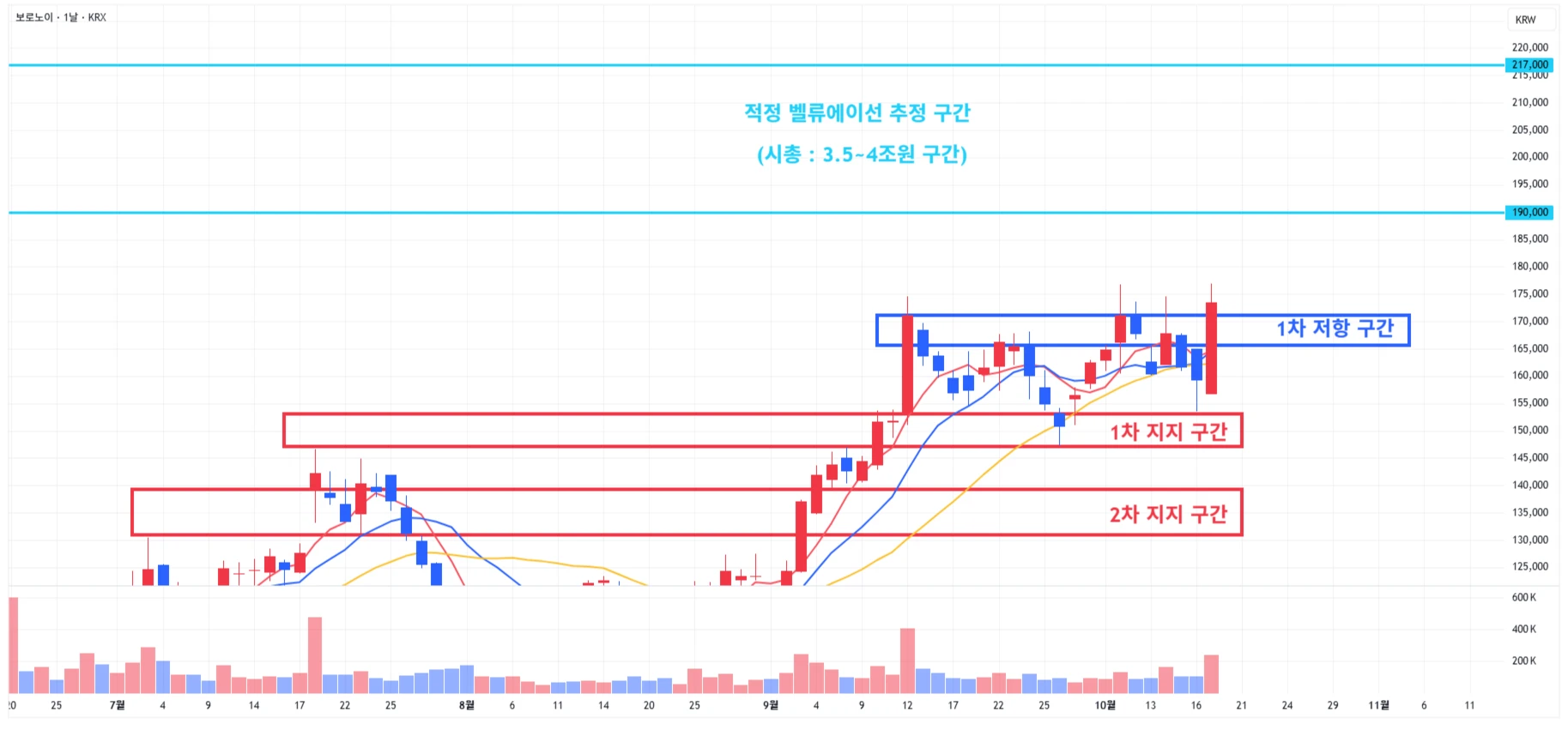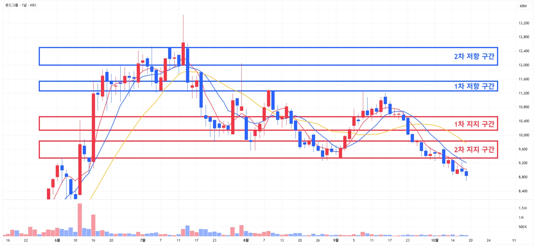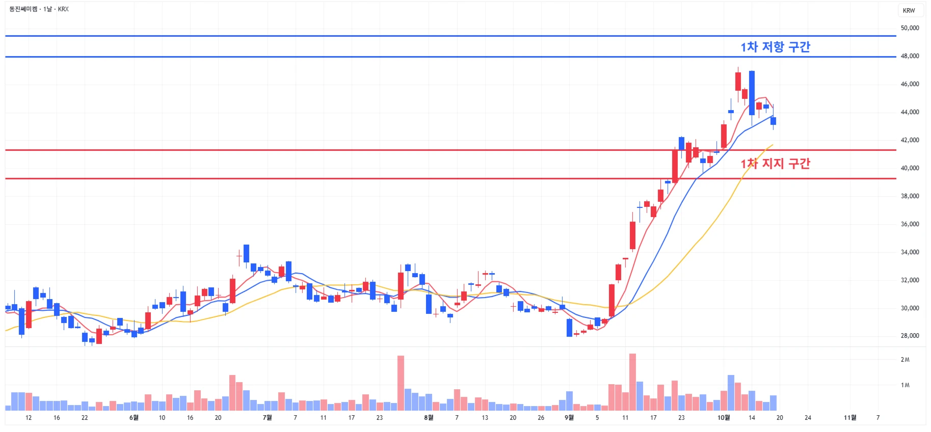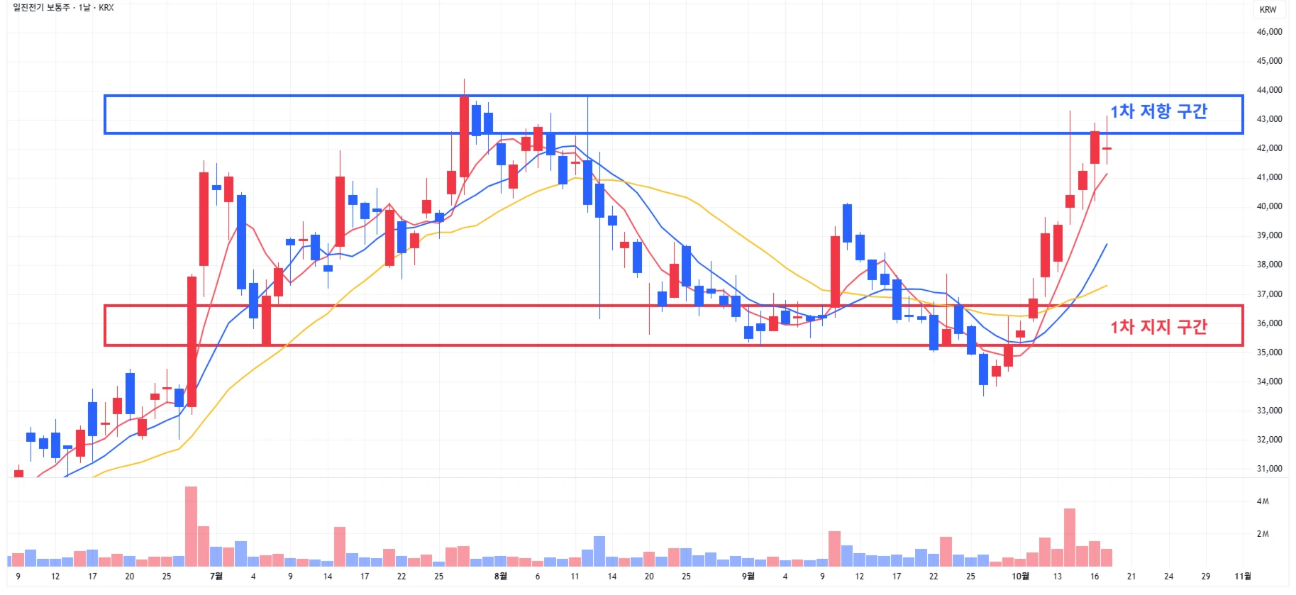 → 매수 시나리오 예시) 1) 1차 지지 구간 내 분할 매수 진행 2) 1차 지지 구간 하단 이탈 시에는 일부 물량 손절 후, 2차 지지 구간 도달 시 분할 매수 진행