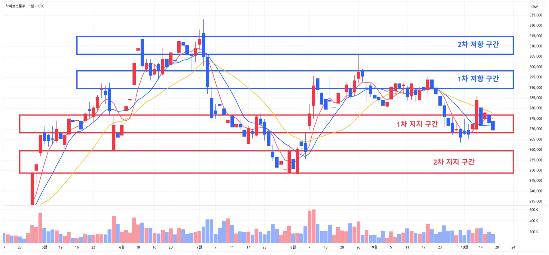 4) 하이브 : 섹터 전반적 약세 지속에 다시 1차 지지 구간 하단으로 하락하며 마무리