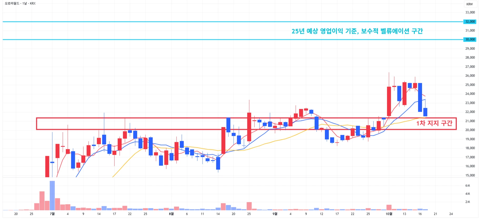 5) 오로라 : 당일에도 하락이 발생하며 1차 지지 구간 상단 위에서 마무리