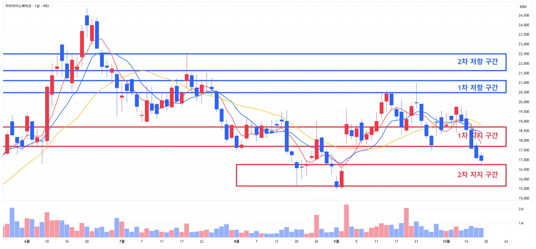 2) 지아이이노베이션 : 하락이 이어지며 당일 2차 지지 구간 상단 위에서 마무리* 10월 17일 ~ 21일 유럽종양학회에서 'GI-102' 단독요법, 키트루다 병용요법 1·2상 연구 데이터 발표 계획