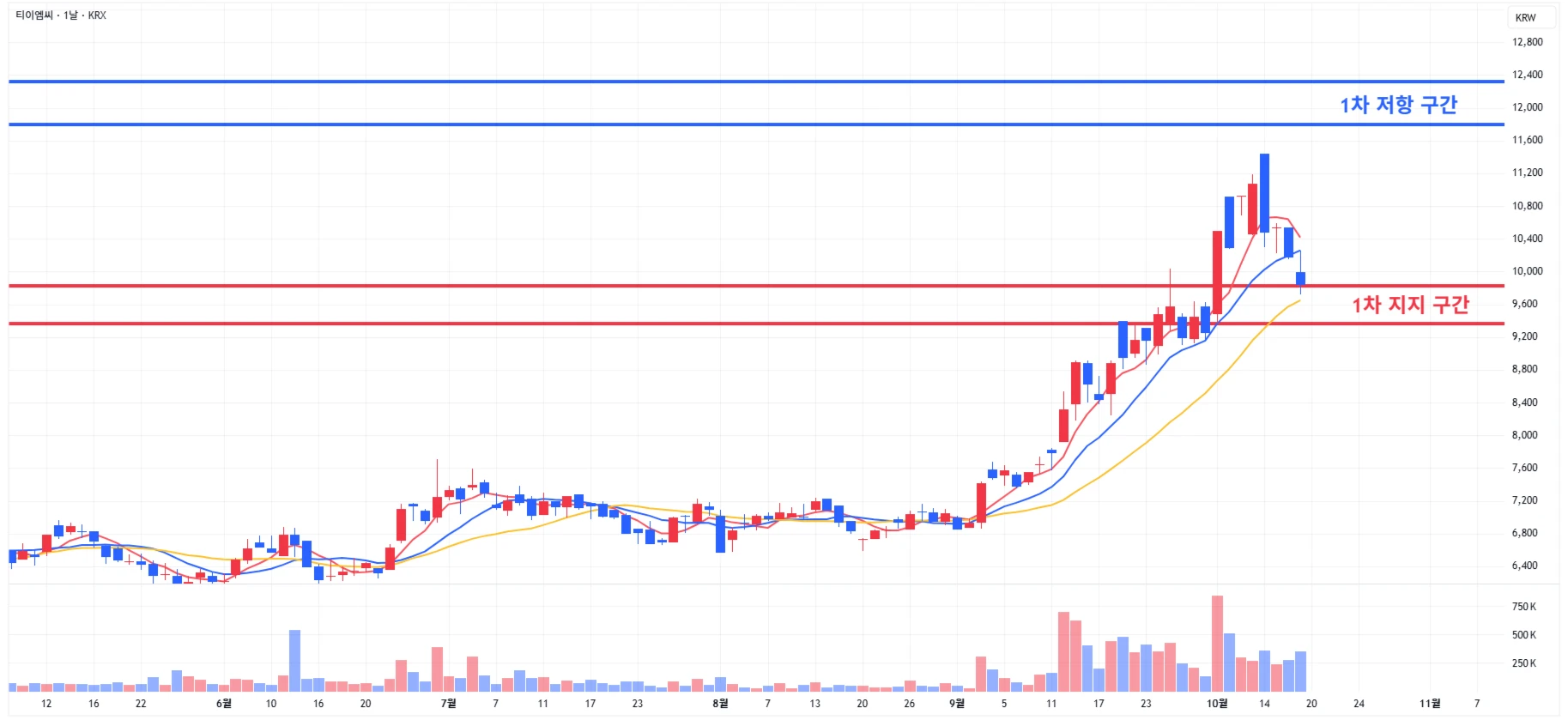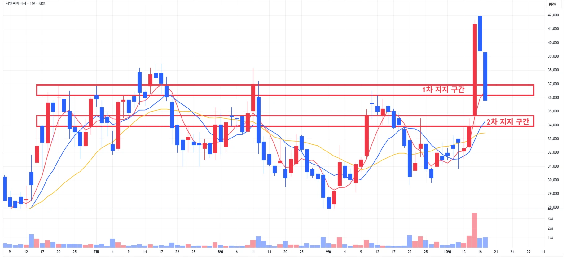 1) 지엔씨에너지 : 기관, 외국인 양매도세에 당일 큰폭의 조정 발생하며 1차 지지 구간 이탈 * 넥스트레이더 장에서 추가 하락하며 2차 지지 구간 까지 도달한 상황