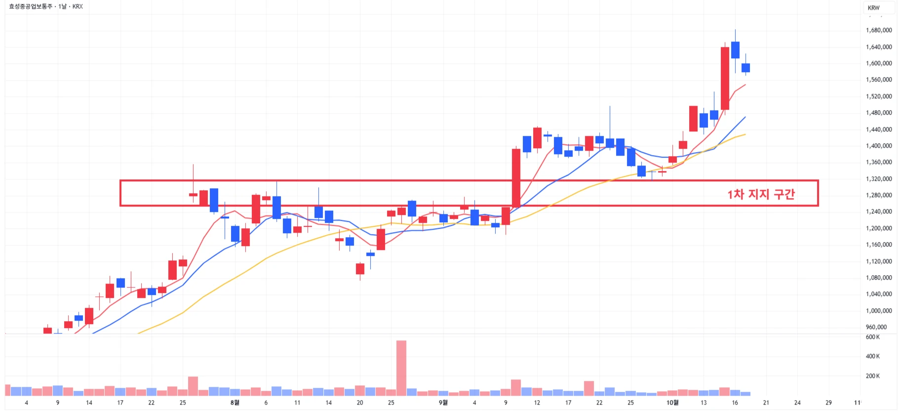 → 매수 시나리오 예시) 1차 지지 구간 도달 시 분할 매수 진행 * 1차적 상승이 발생한 상황이기에 섣부른 추격매수는 위험함을 인지