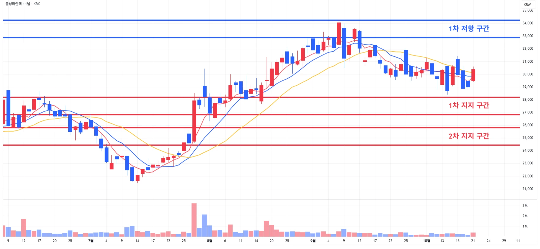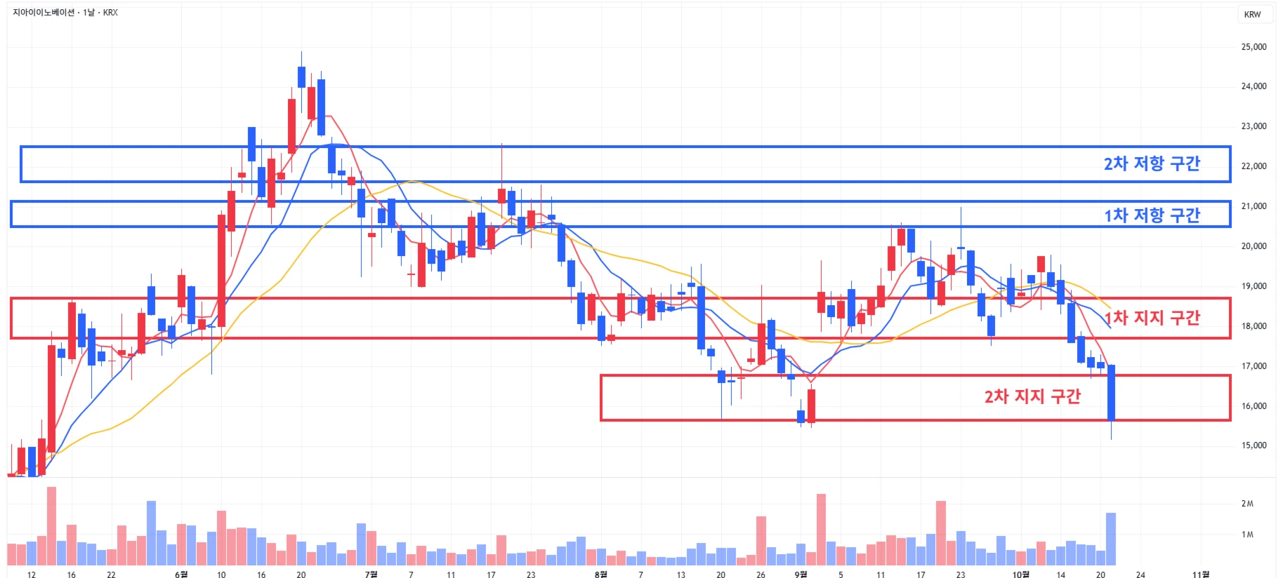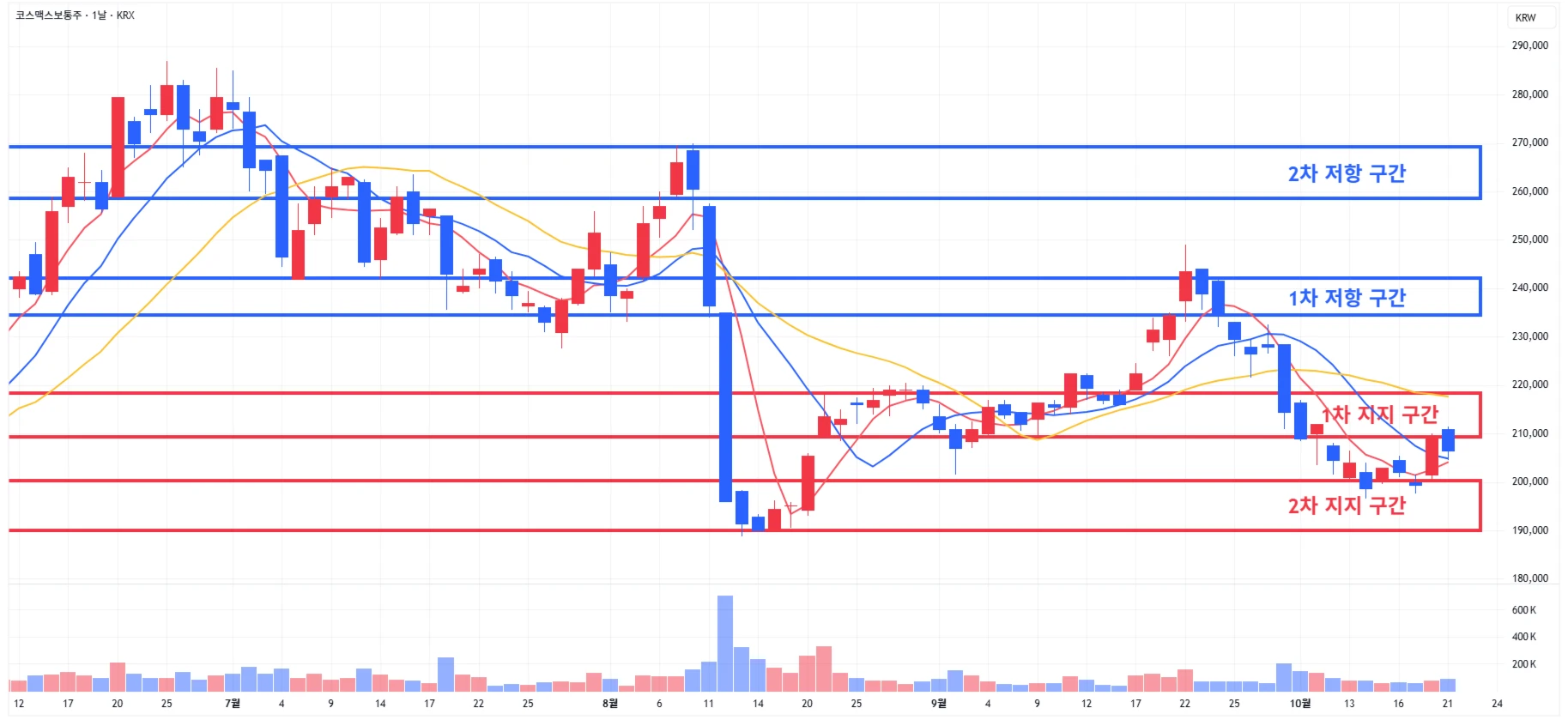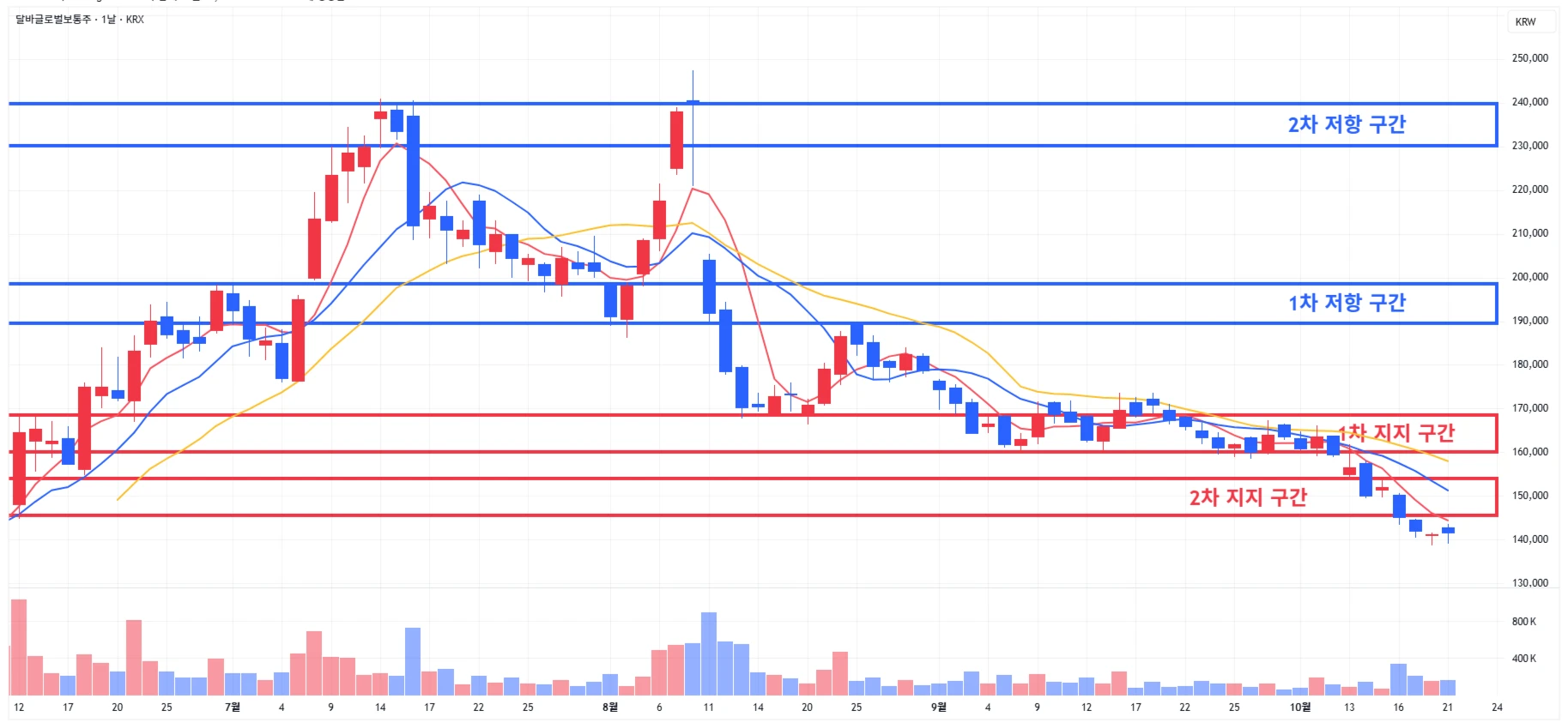 → 매수 시나리오 예시) 1) 1차 지지 구간 내 분할 매수 진행 2) 1차 지지 구간 하단 이탈 시에는 일부 물량 손절 후, 2차 지지 구간 도달 시 분할 매수 진행