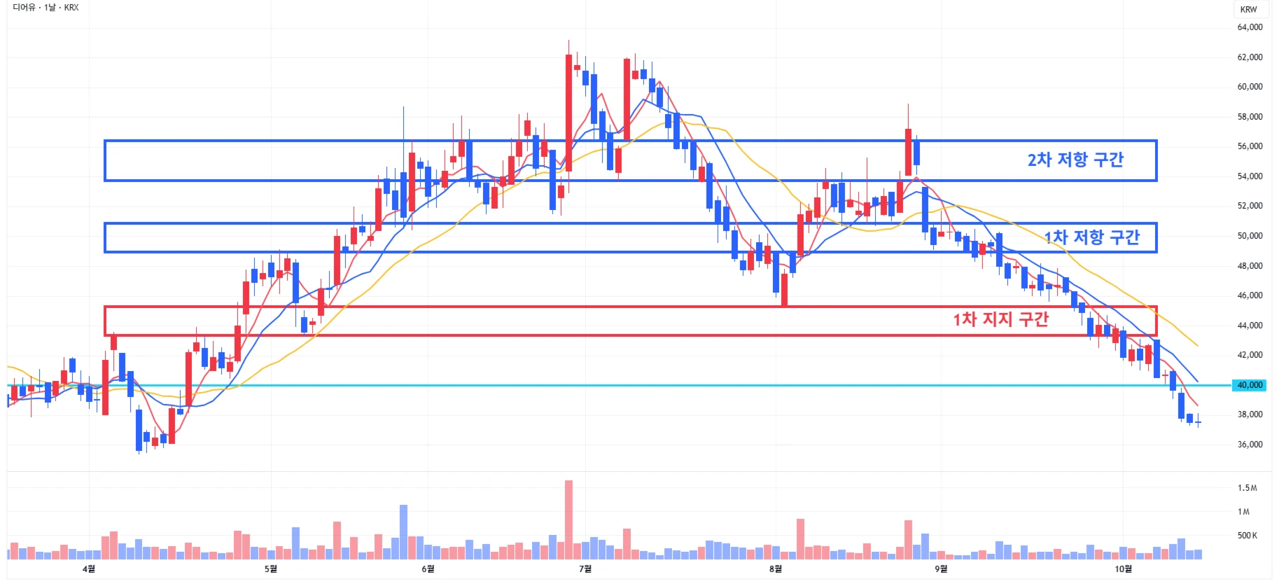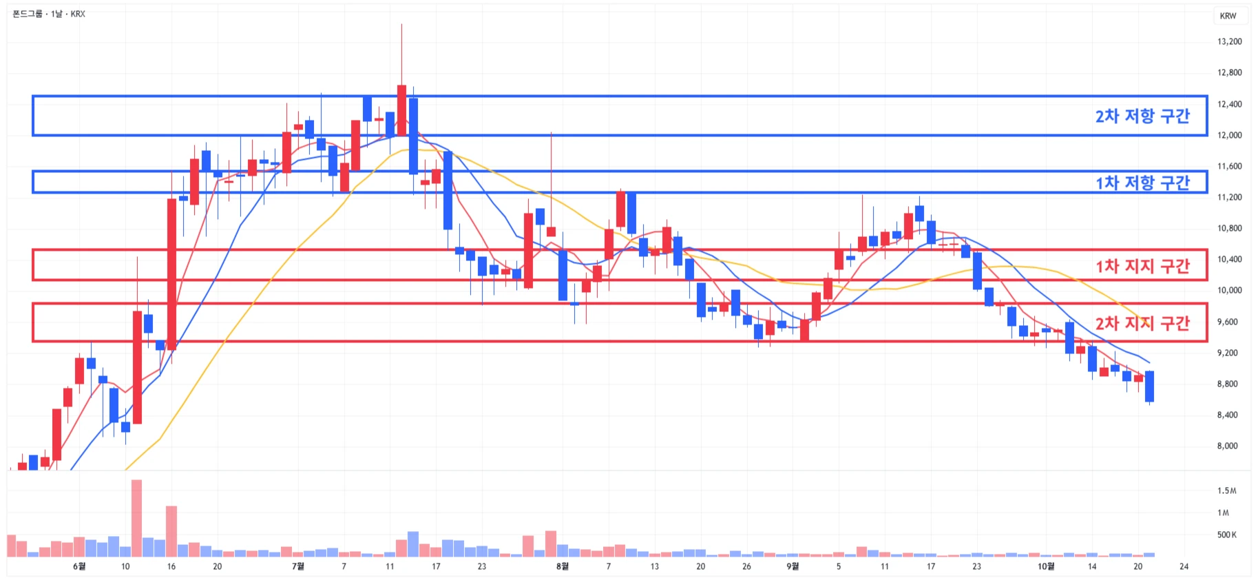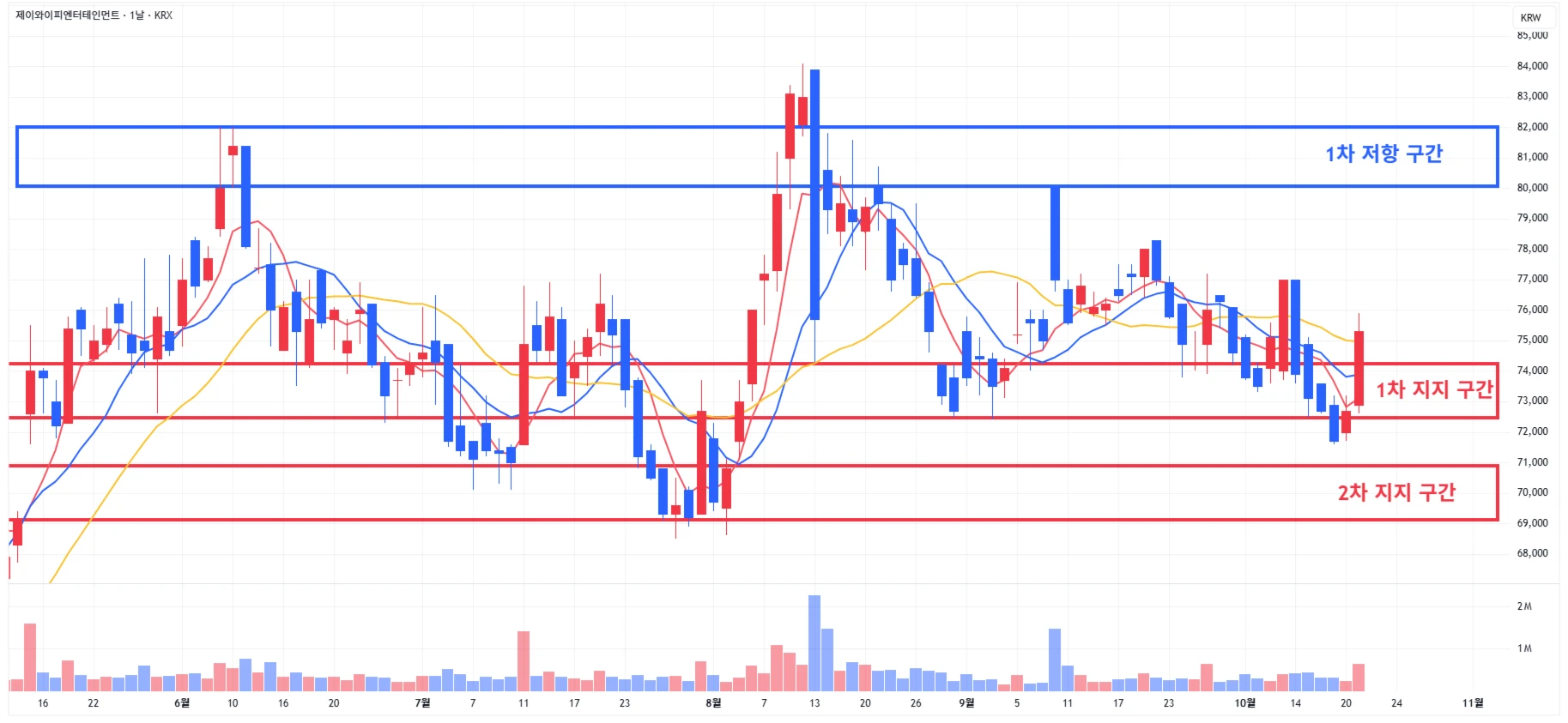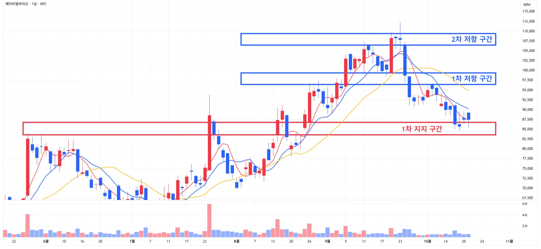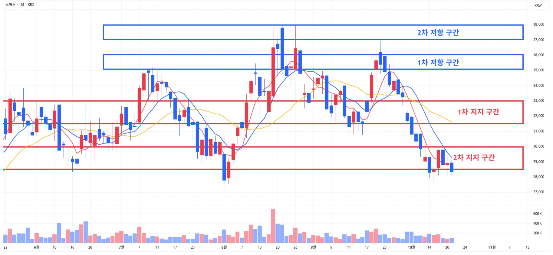 → 매수 시나리오 예시) 1) 1차 지지 구간 내 분할 매수 진행 2) 1차 지지 구간 하단 이탈 시에는 일부 물량 손절 후, 2차 지지 구간 도달 시 분할 매수 진행
