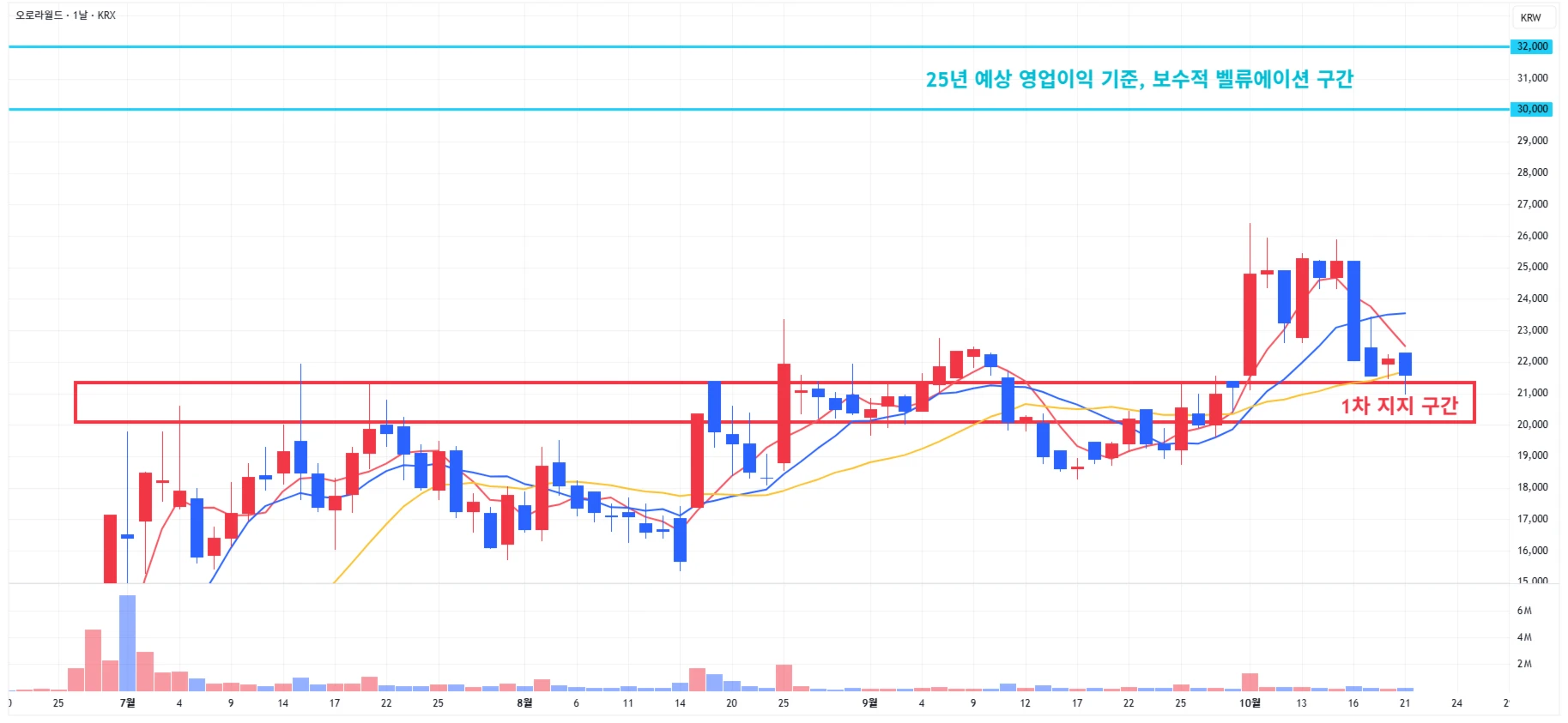 5) 오로라 : 당일 장중 1차 지지 구간 상단을 이탈하기도 하였으나, 재차 회복하여 상단 위에서 마무리