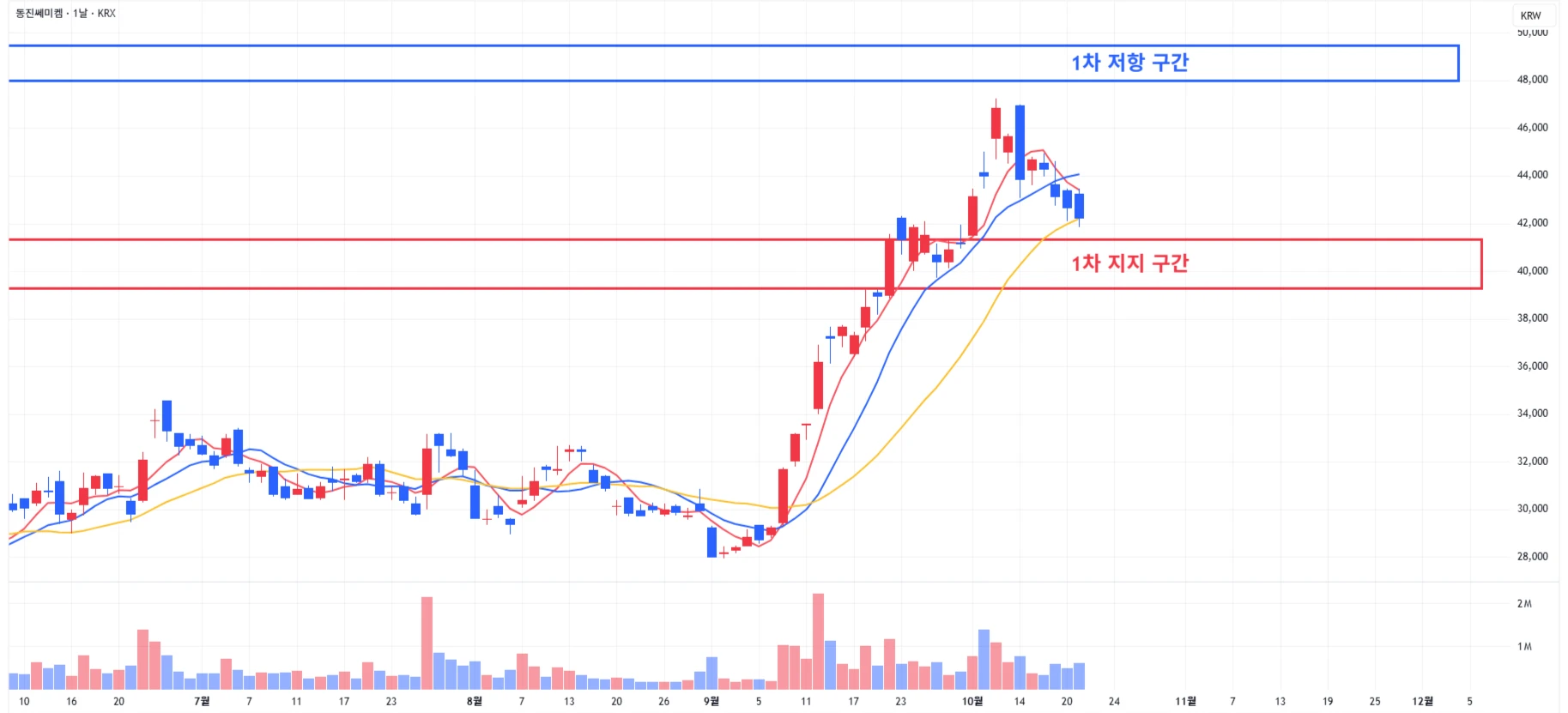 1) 동진쎄미켐 : 조정이 지속되며 1차 지지 구간 근처까지 도달하는 모습