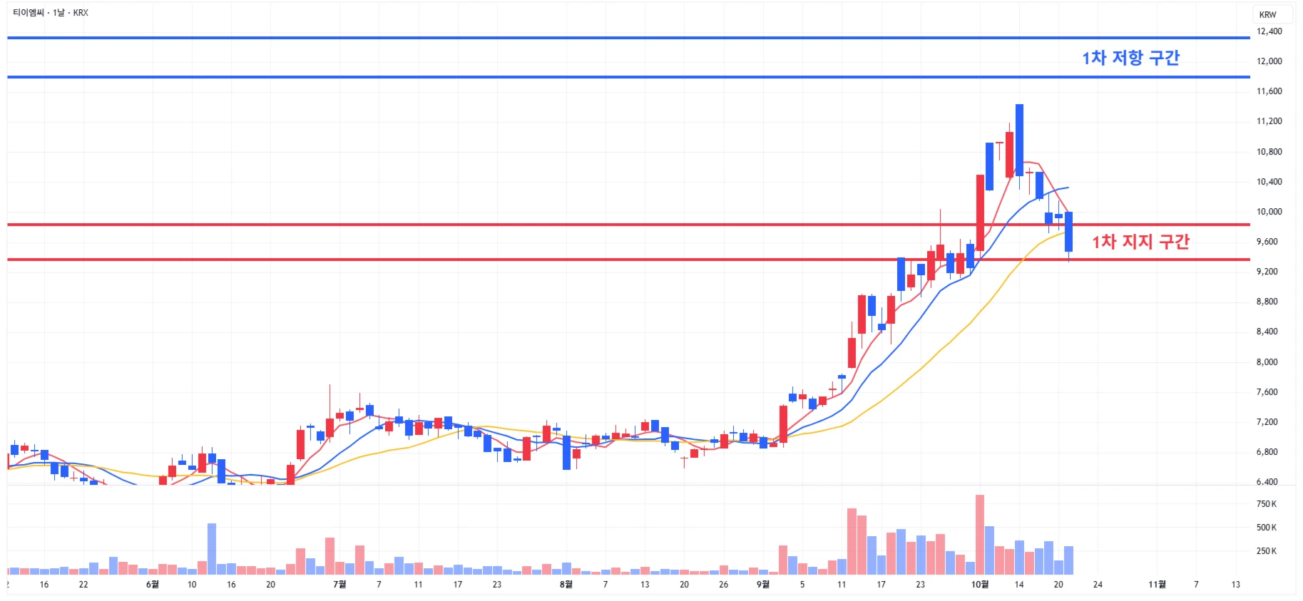 2) 티이엠씨 : 당일 섹터 약세에 조정이 발생했지만, 2차 지지 구간 하단에서 마무리
