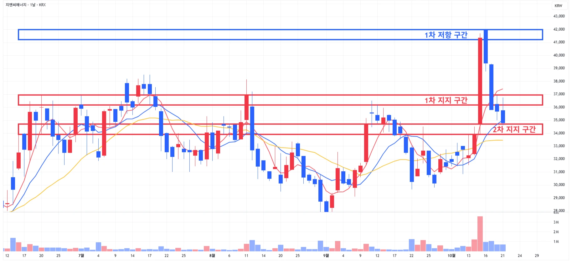 1) 지엔씨에너지 : 조정이 이어지는 상황으로, 당일 2차 지지 구간 상단까지 하락하며 마무리