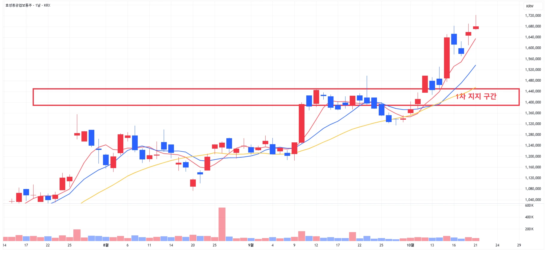 → 매수 시나리오 예시) 1차 지지 구간 도달 시 분할 매수 진행 * 1차적 상승이 발생한 상황이기에 섣부른 추격매수는 위험함을 인지