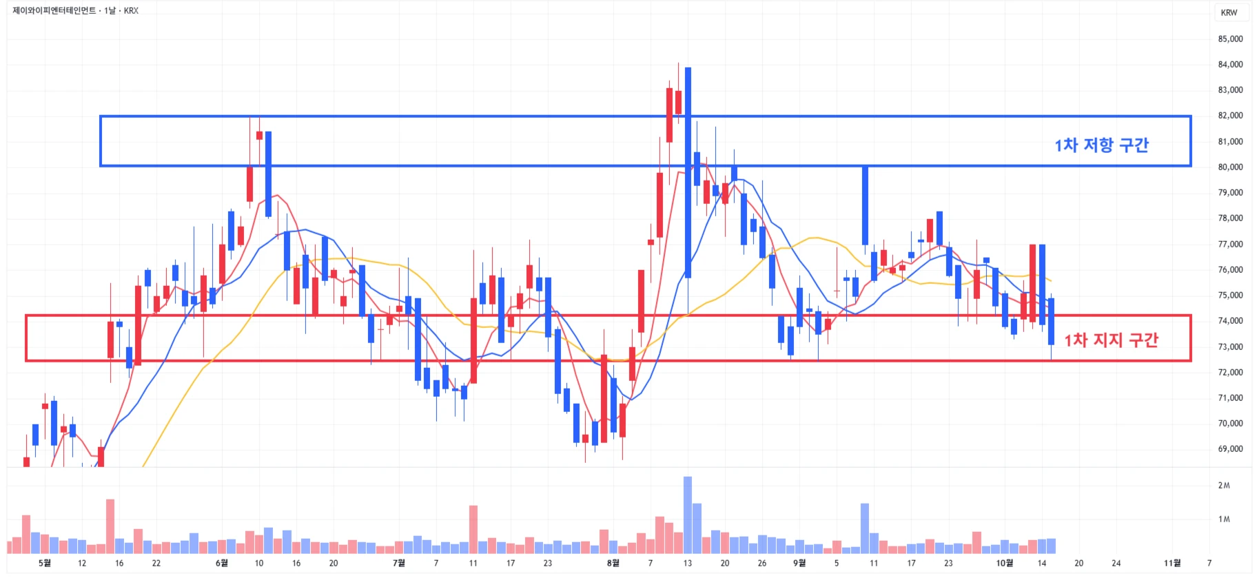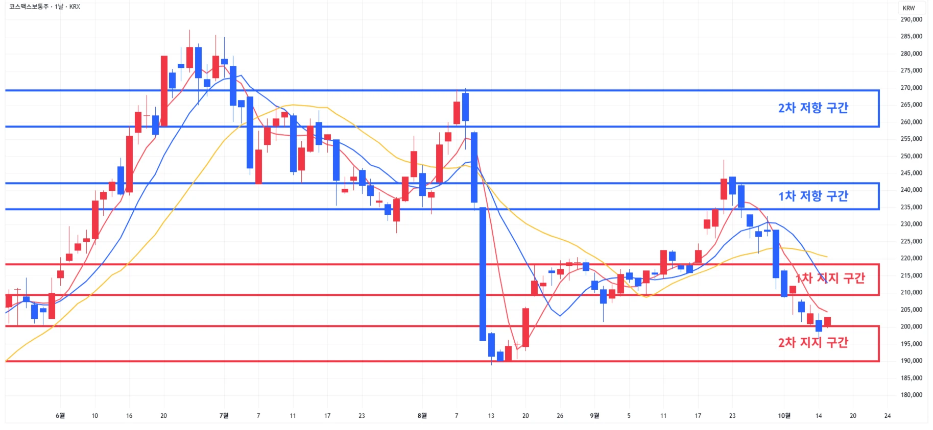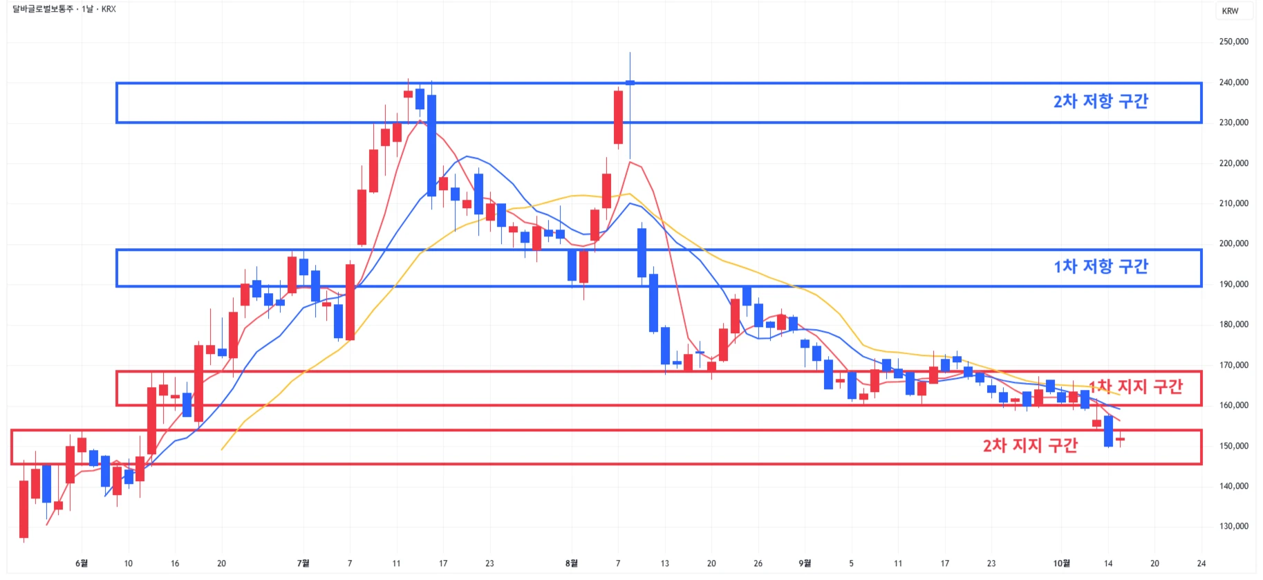 → 매수 시나리오 예시) 1) 1차 지지 구간 내 분할 매수 진행 2) 1차 지지 구간 하단 이탈 시에는 일부 물량 손절 후, 2차 지지 구간 도달 시 분할 매수 진행