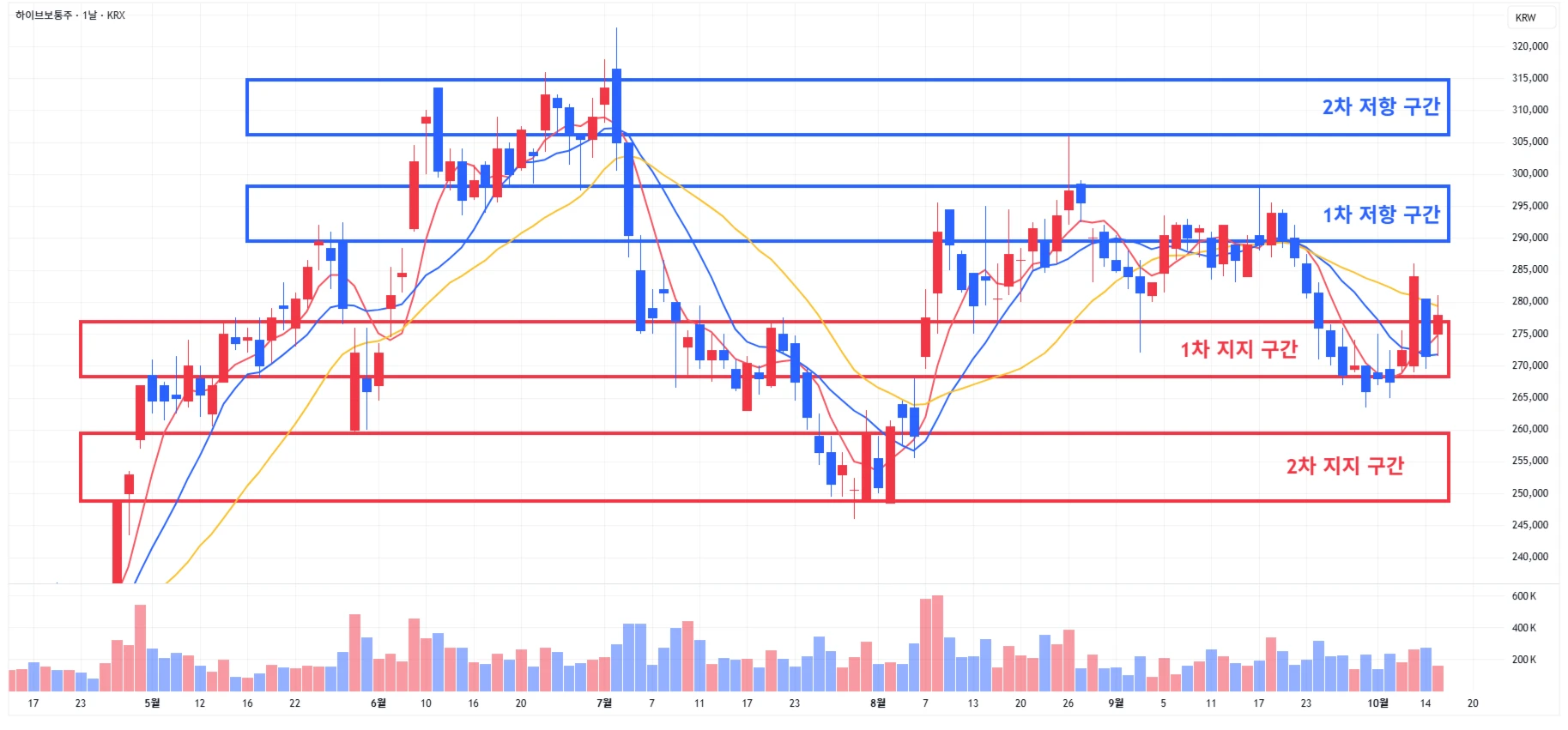 4) 하이브 : 당일 소폭 반등에 성공하며 다시 1차 지지 구간 상단 위로 회복해주며 마무리