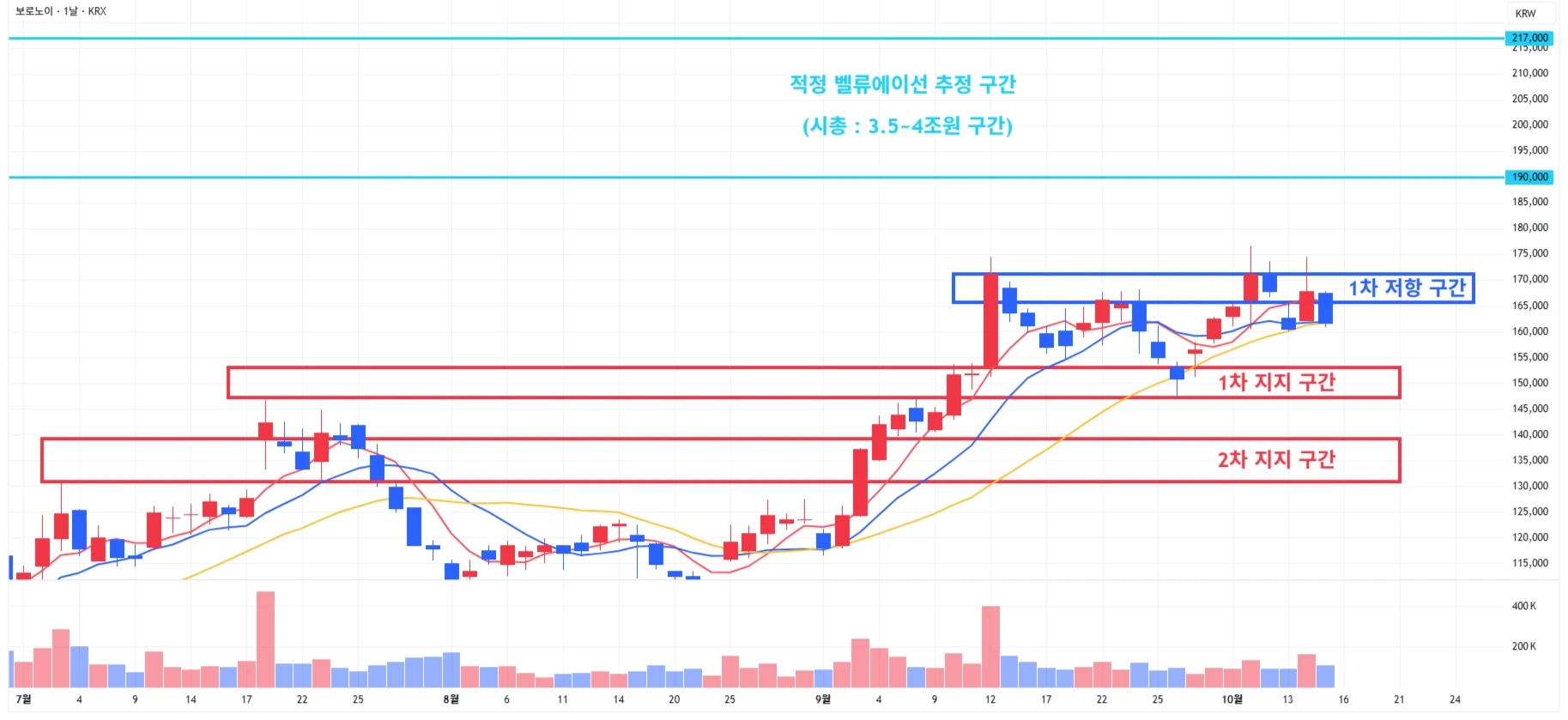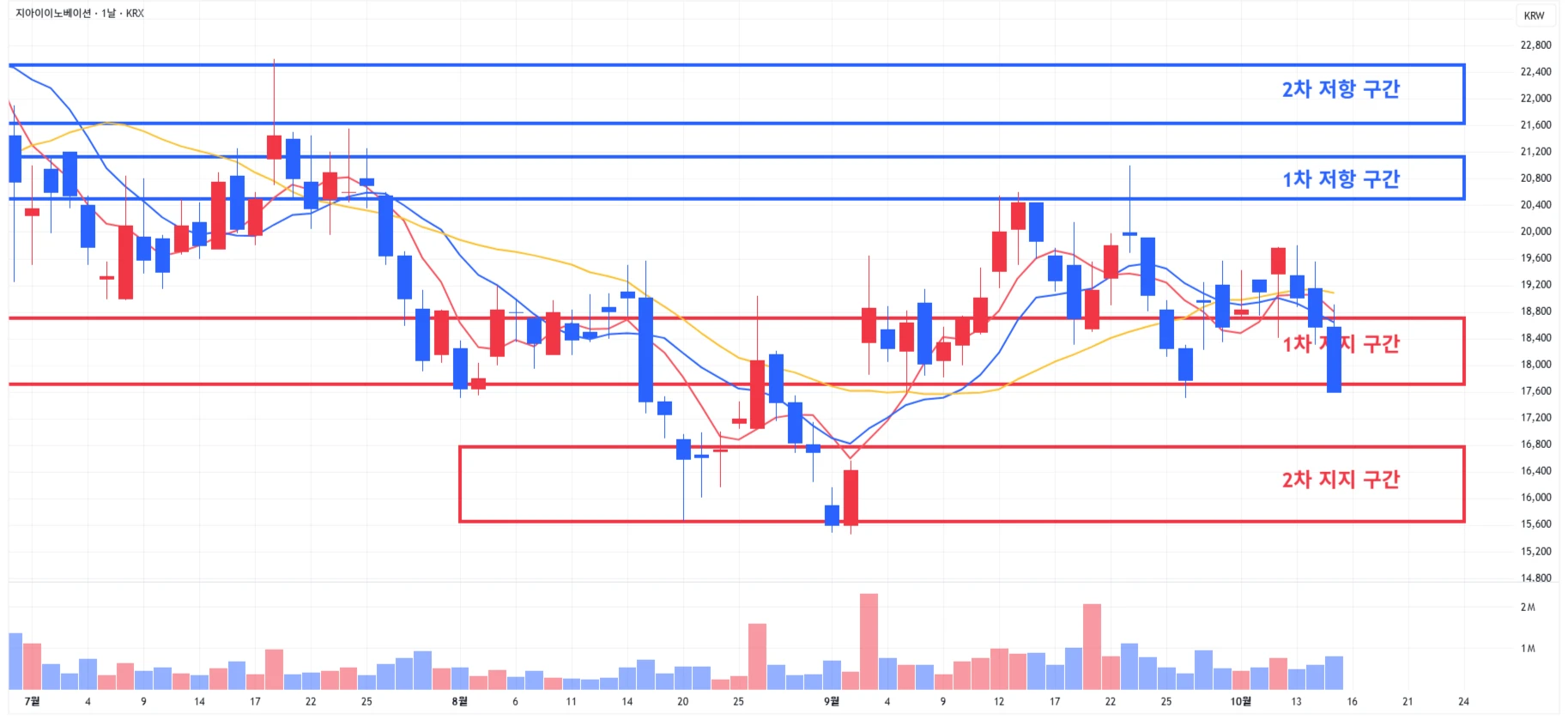 → 매수 시나리오 예시) * 10월 17일 ~ 21일 유럽종양학회에서 'GI-102' 단독요법, 키트루다 병용요법 1·2상 연구 데이터 발표 계획 1) 1차 지지 구간 내 분할 매수 진행 2) 1차 지지 구간 하단 이탈 시에는 일부 물량 손절 후, 2차 지지 구간 도달 시 분할 매수 진행