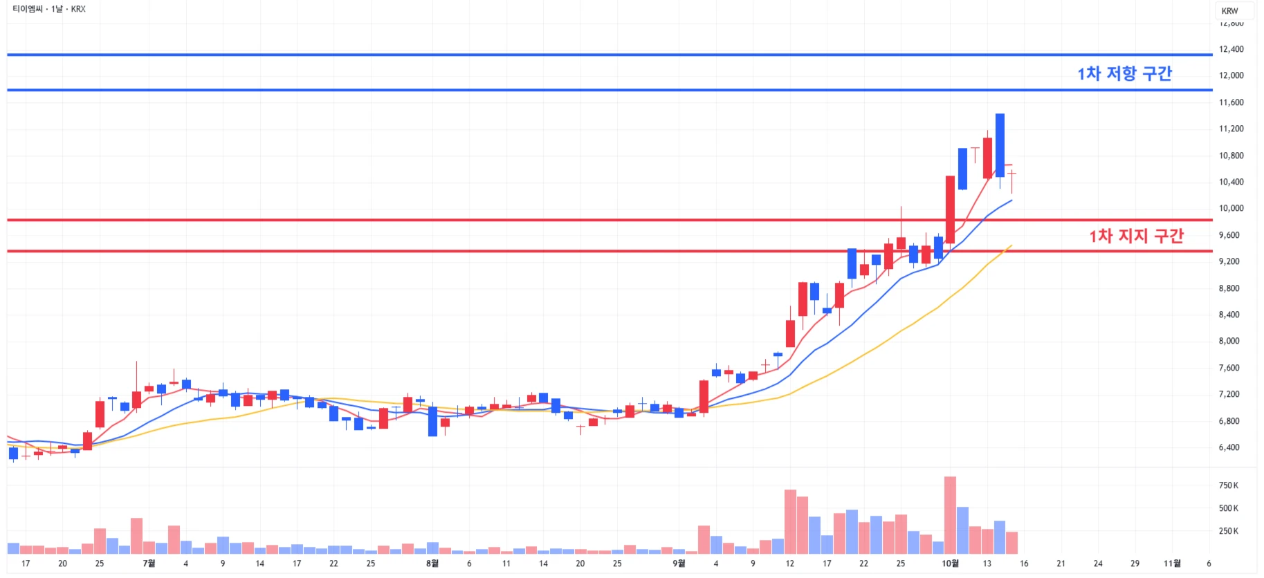 2) 티이엠씨 : 장중 추가 하락이 발생하기도 하였지만, 재차 회복하며 전일 가격 근처에서 마무리