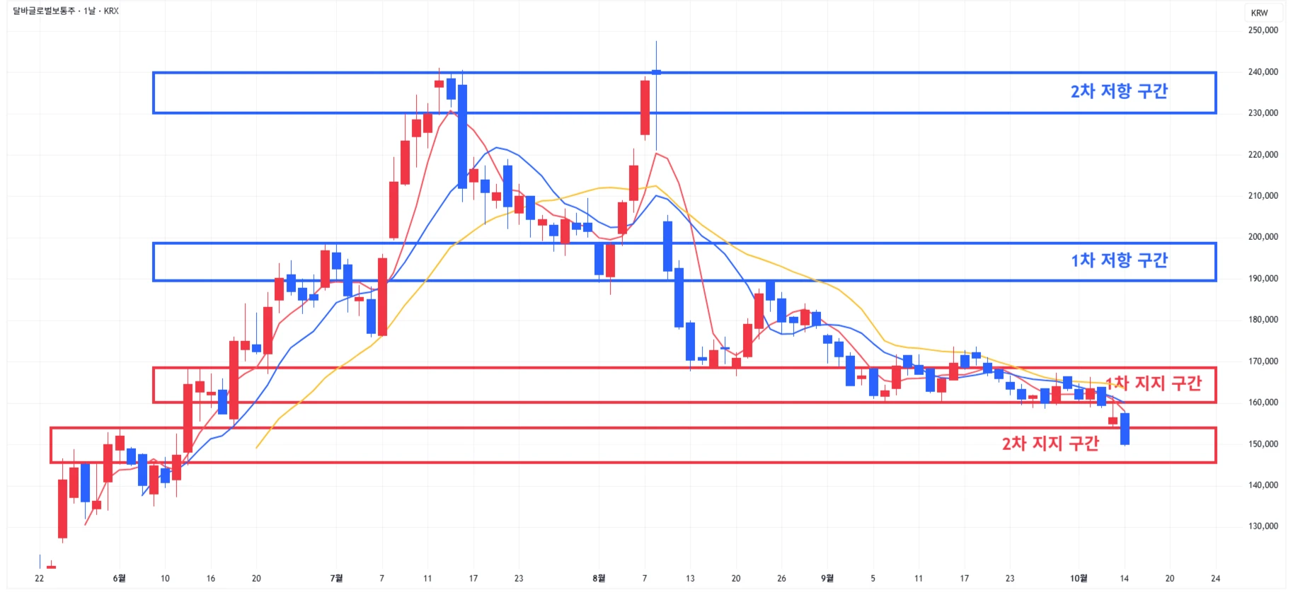 → 매수 시나리오 예시) 1) 1차 지지 구간 내 분할 매수 진행 2) 1차 지지 구간 하단 이탈 시에는 일부 물량 손절 후, 2차 지지 구간 도달 시 분할 매수 진행