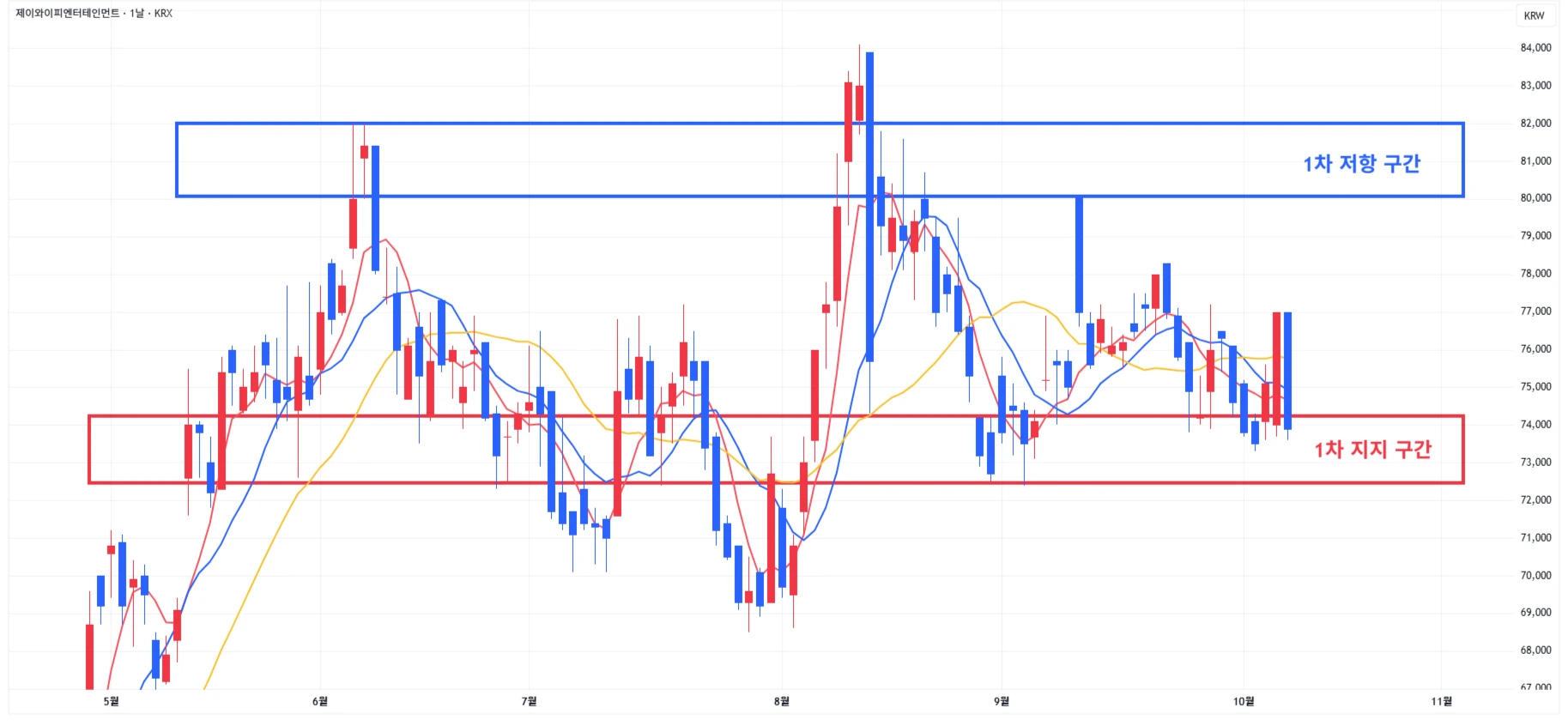 1) JYP : 시장의 하락 반전으로 전일 상승분을 모두 반납하며 1차 지지 구간 상탄 이탈 마무리