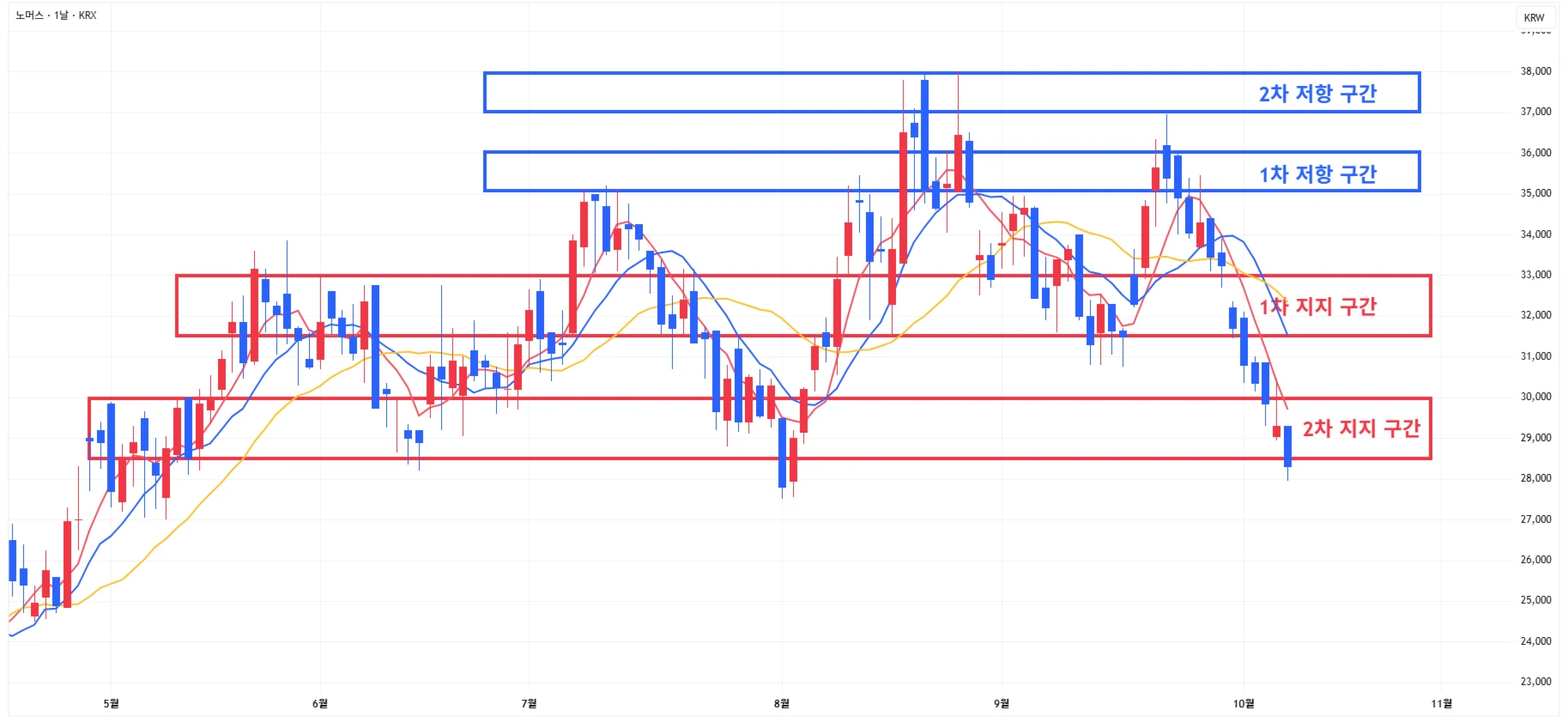 2) 노머스 : 시장 약세에 하락세가 이어지며 2차 지지 구간 하단을 소폭 이탈하며 마무리