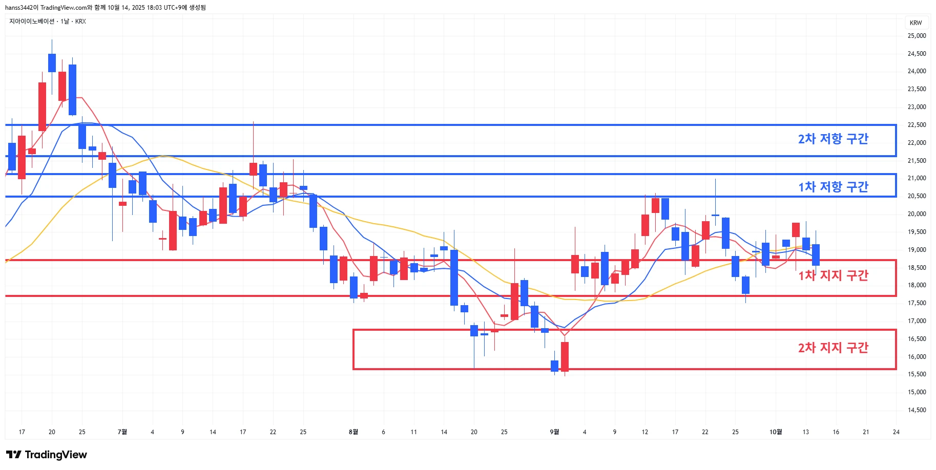 2) 지아이이노베이션 : 시장 약세에 당일 하락하며 1차 지지 구간 상단 이탈 후 마무리