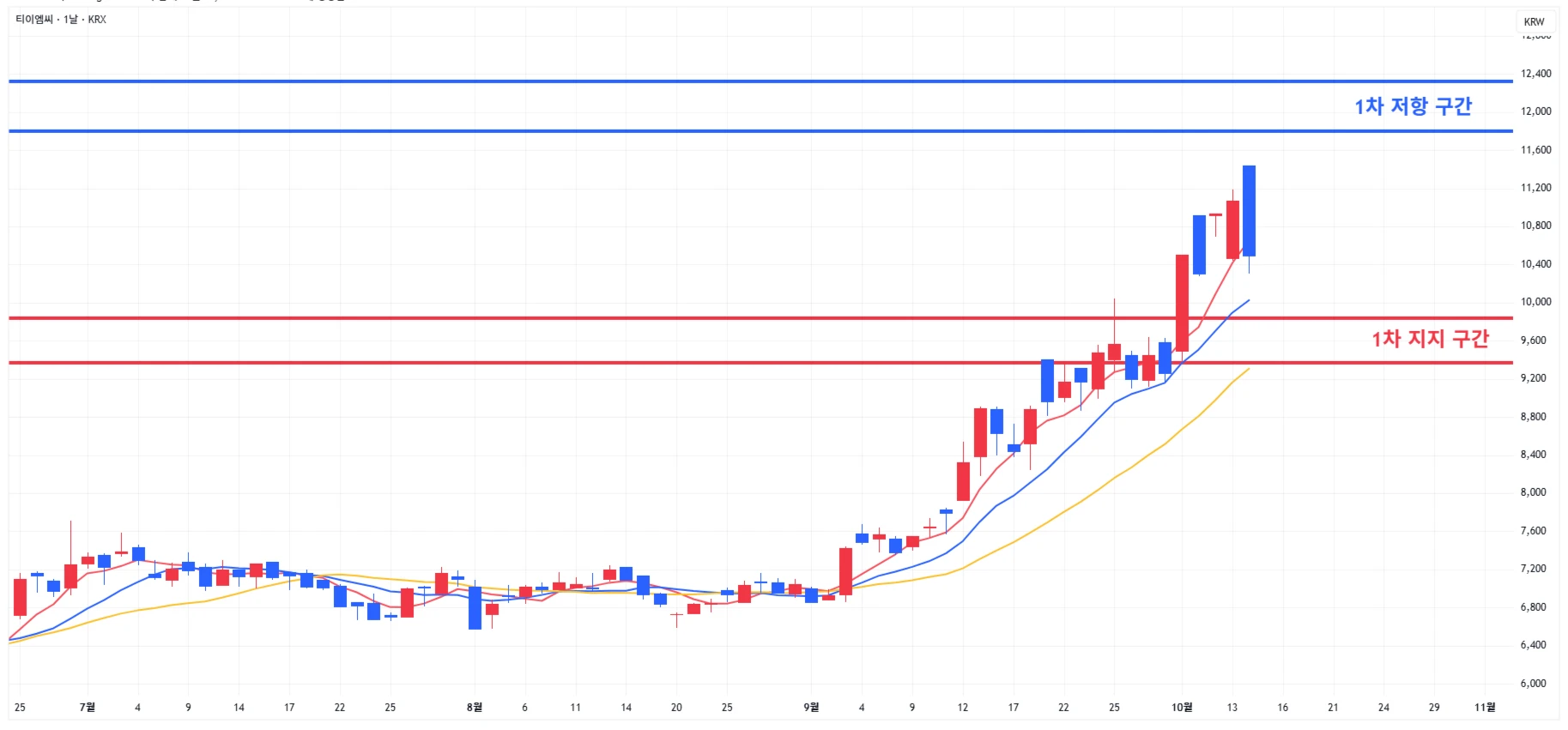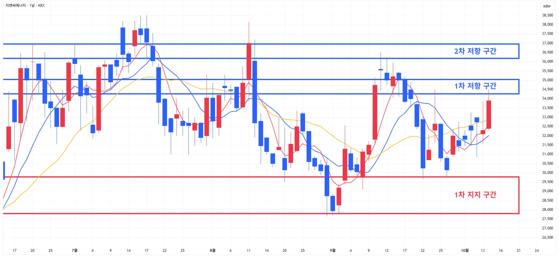 1) 지엔씨에너지 : 3분기 실적 호조 기대감이 커지며 당일 시장 약세에도 1차 저장 구간에 도달