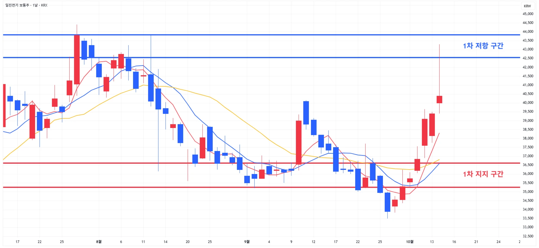 2) 일진전기 : 당일 큰 상승이 나오며 장중 2차 저항 구간까지도 도달하였으나, 시장약세에 상승분을 크게 반납하며 1차 저항 구간 하단에서 마무리