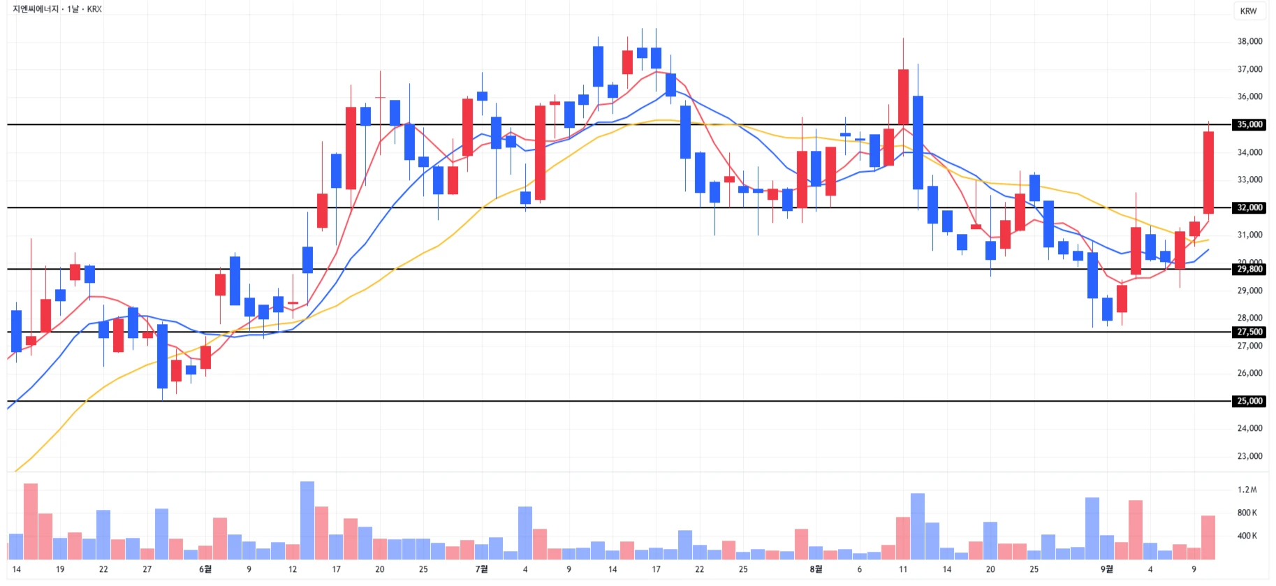 지엔씨에너지의 비상발전기 수주 증가 기대감이 반영되며 당일 큰 상승 발생