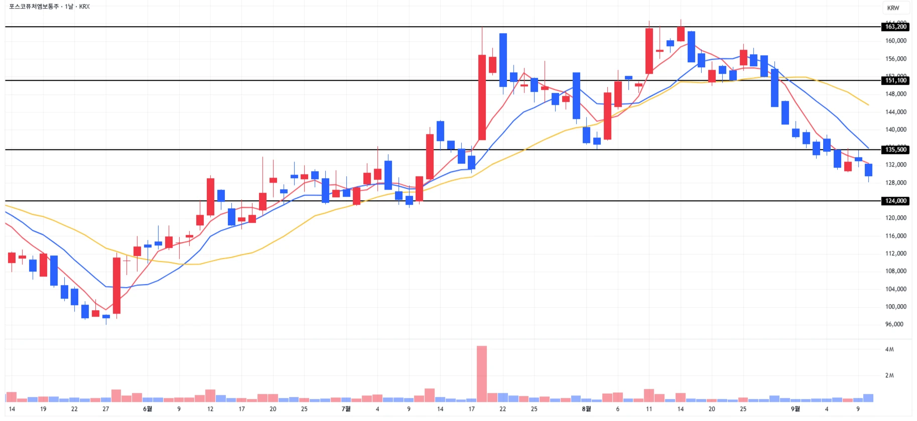 2) 포스코퓨처엠(양극재, 음극재) : 시장 소외에 따 하락세가 이어지는 상황
