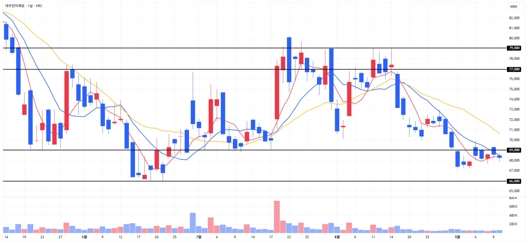 3) 대주전자재료(음극재) : 큰 변동성 없이 당일에도 1차 저항 구간 근처에서 마무리