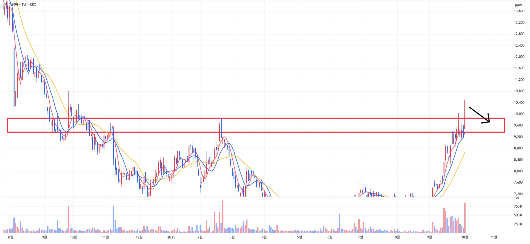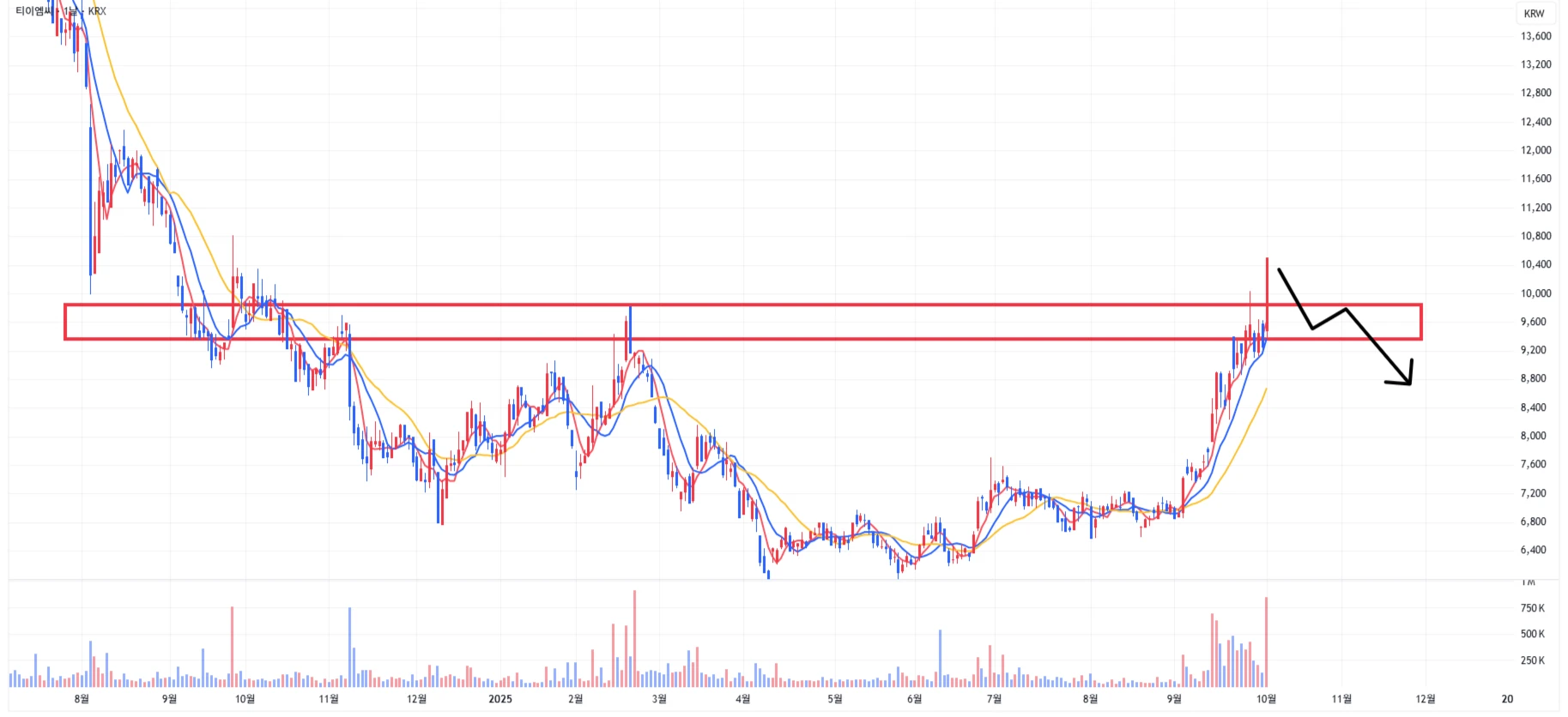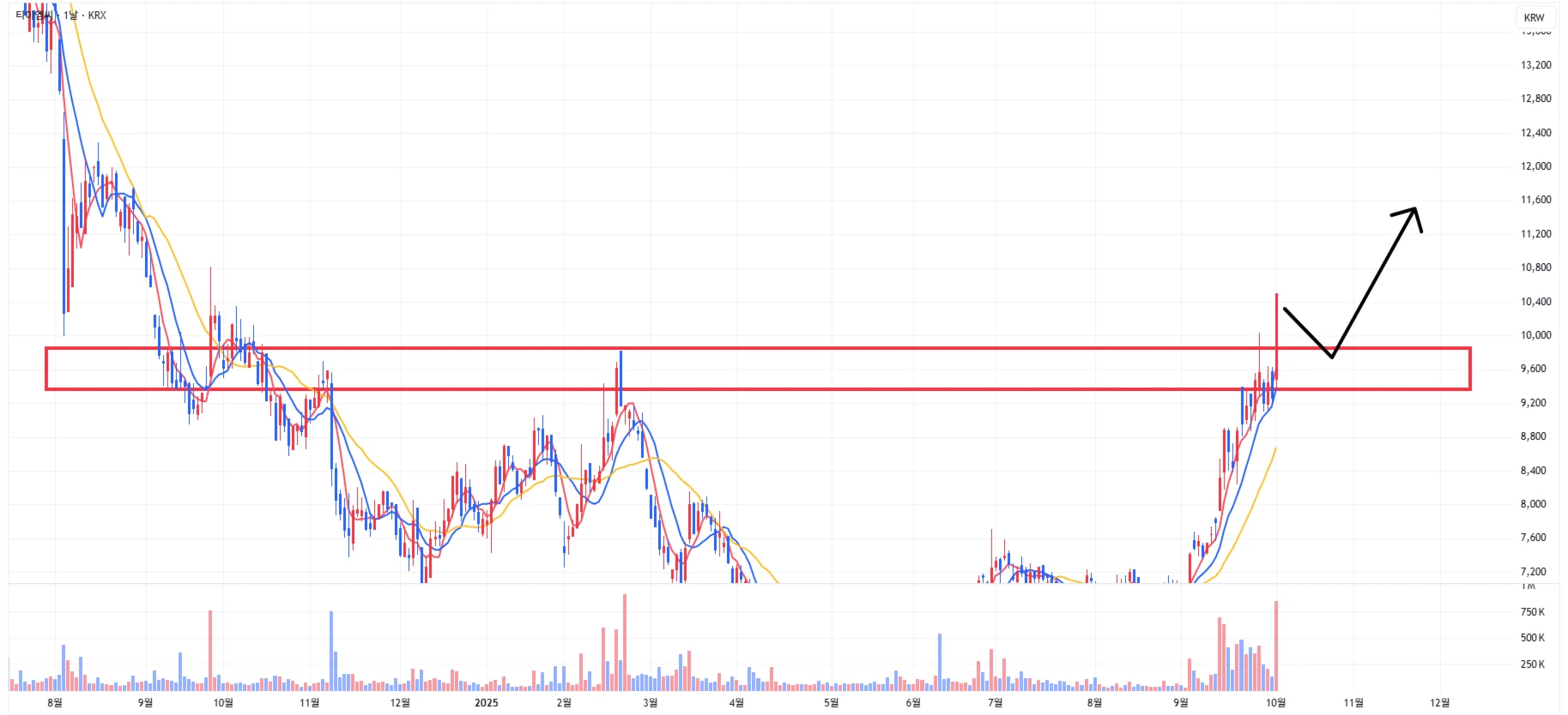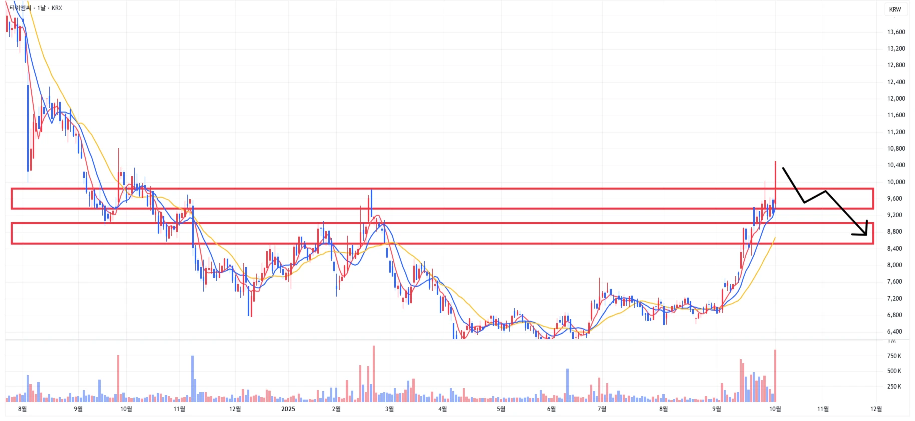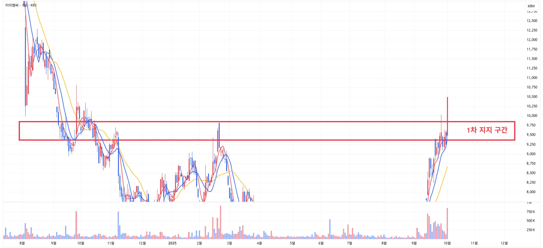 1차 주요 지지 구간은 최근 저항 구간이었던 9,350 ~ 9,850원 구간으로 설정 가능
