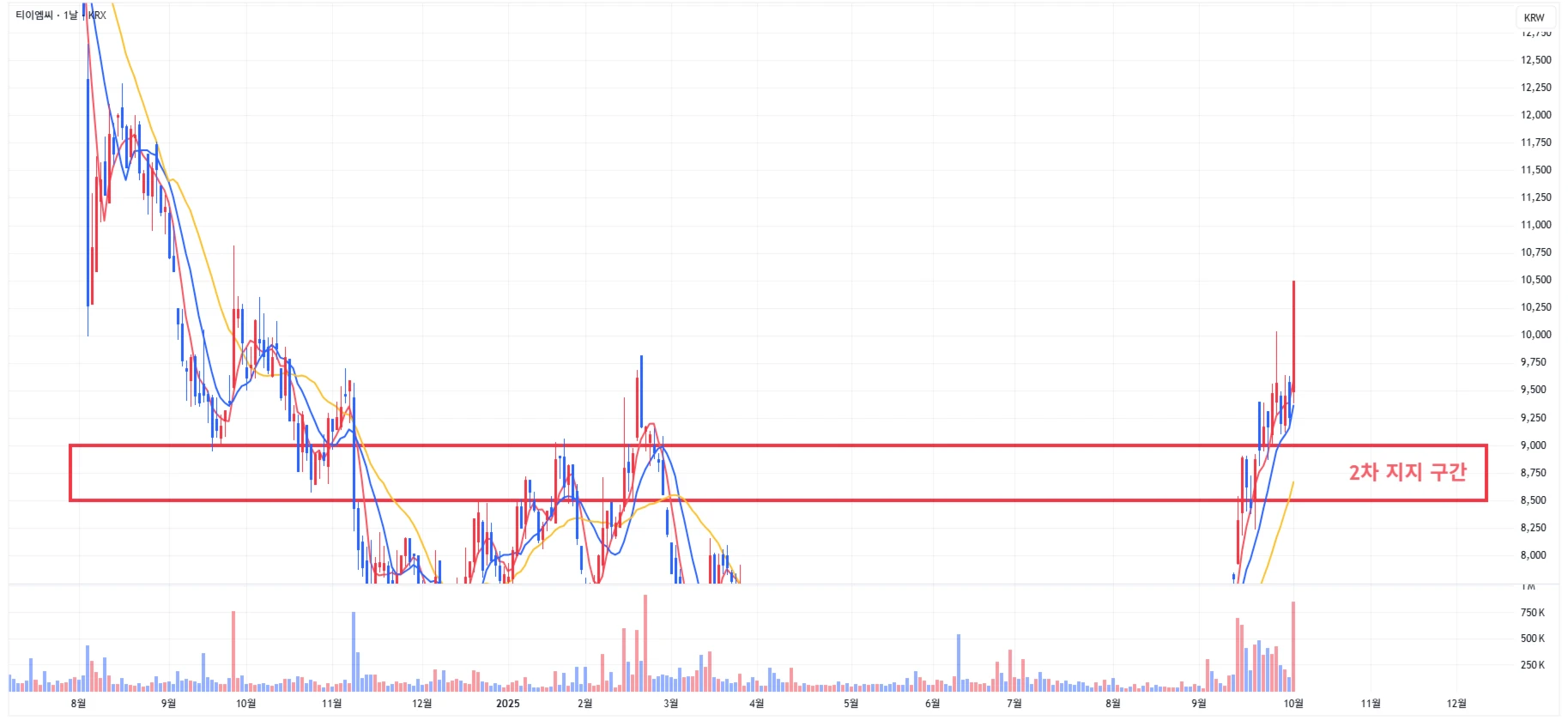 2차 주요 지지 구간은 이전 지지 구간인 8,500 ~ 9,000원 구간으로 설정 가능