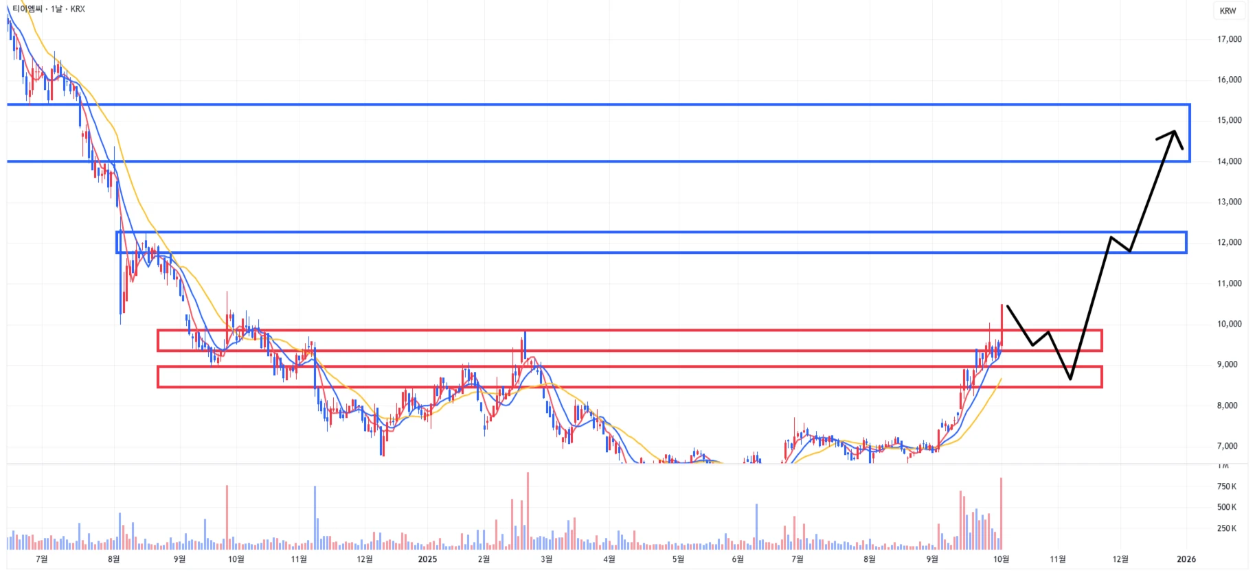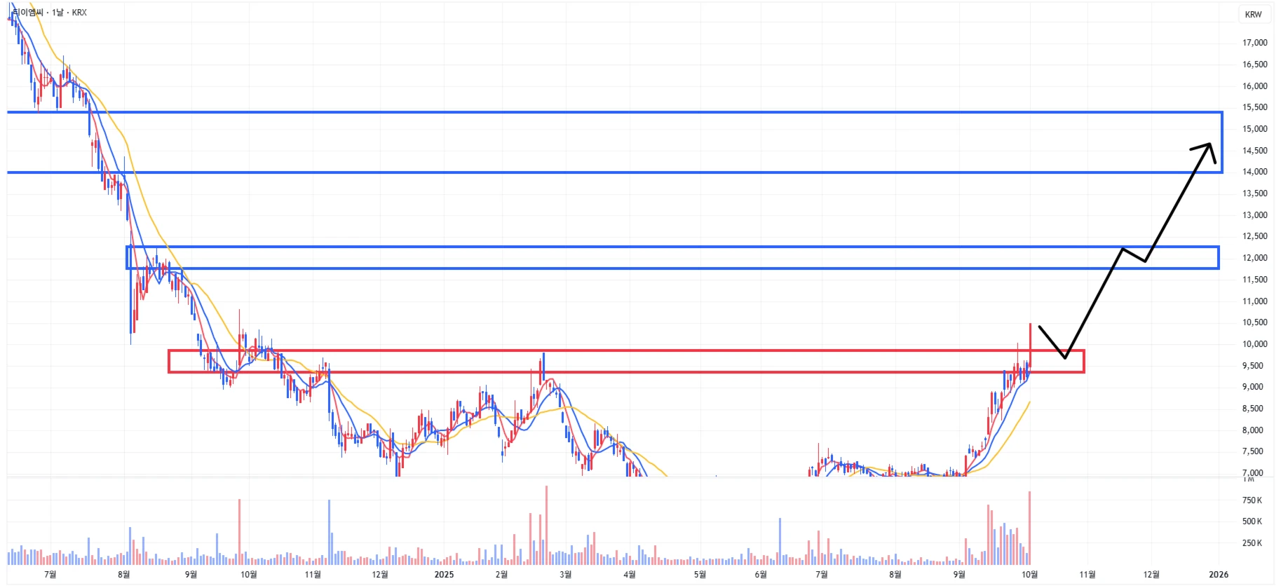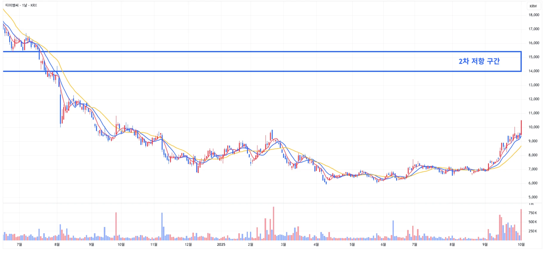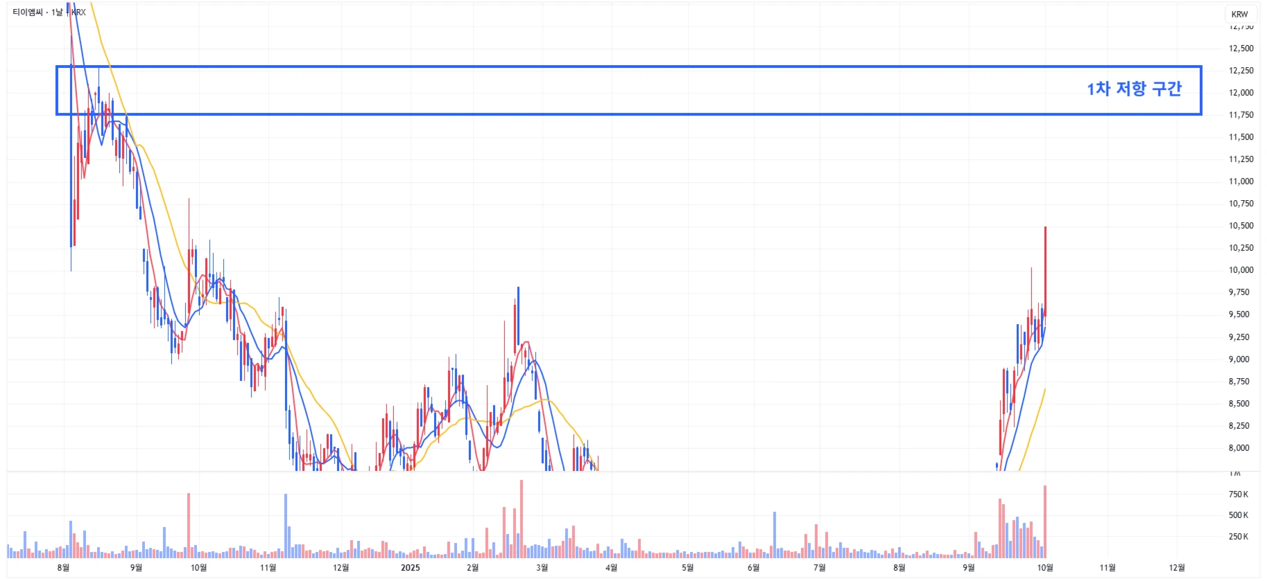→ 최근 반도체 섹터의 전반적인 상승에 따라, 티이엠씨 또한 1차 상승이 발생한 상황이기에