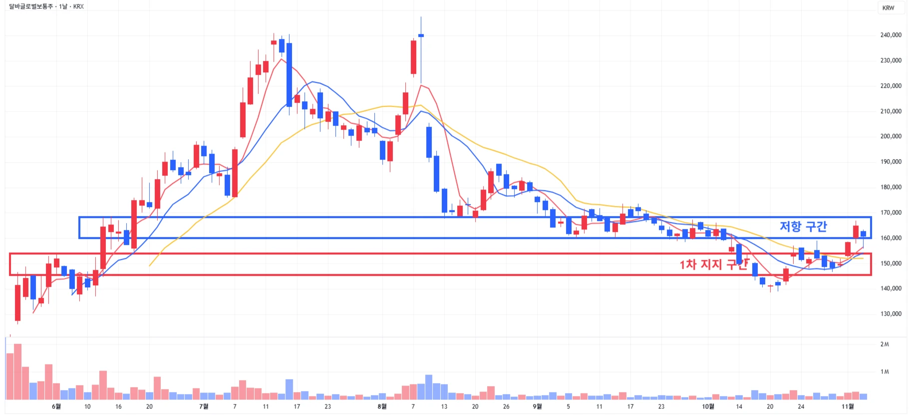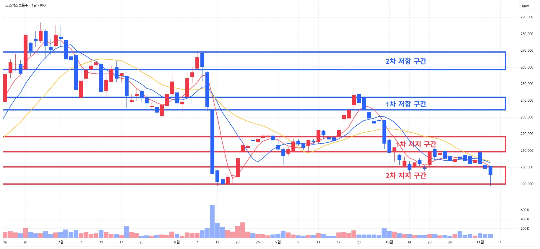 1차 지지 구간 하단 이탈 시에는 일부 물량 손절 후, 2차 지지 구간 도달 시 분할 매수 진행