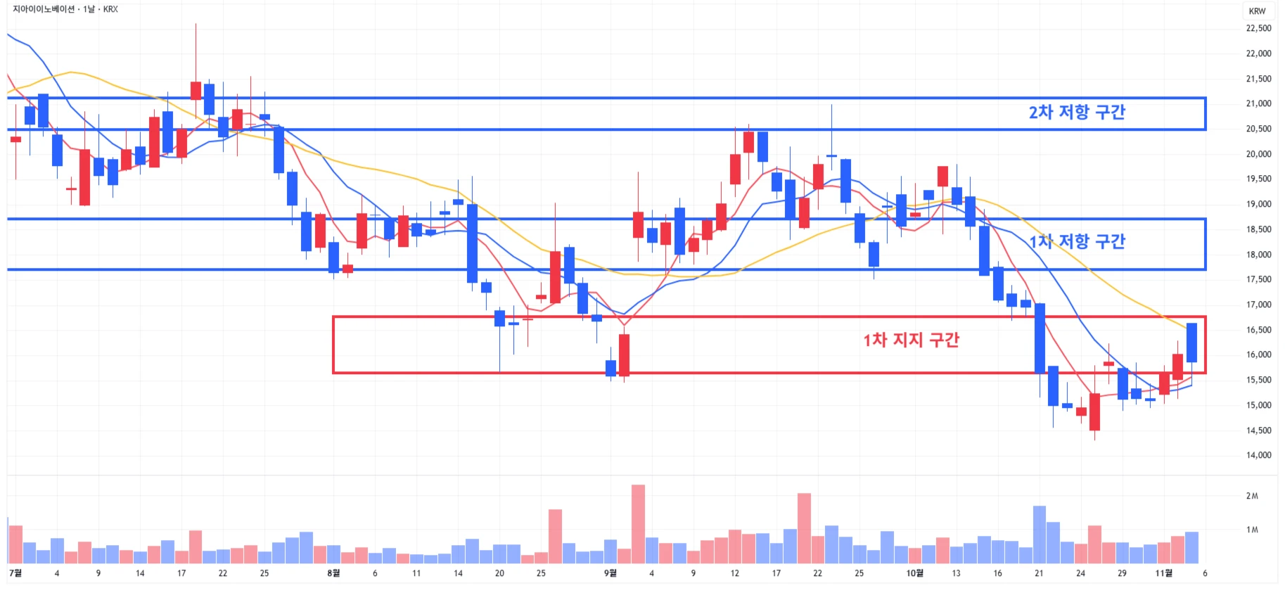 1) 지아이이노베이션 : 당일 장초반 반등세가 이어지는 강한 모습이었으나