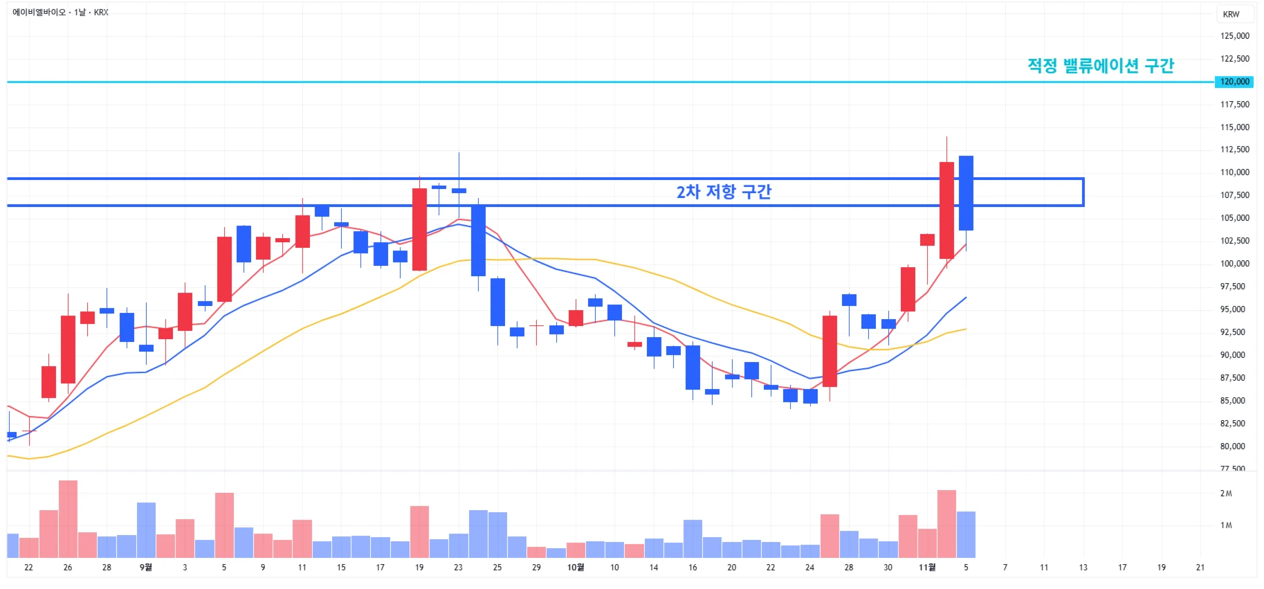 2) 에이비엘바이오 : 최근 상승에 따른 차익실현 물량 출회에 시장 급락이 겹치며,