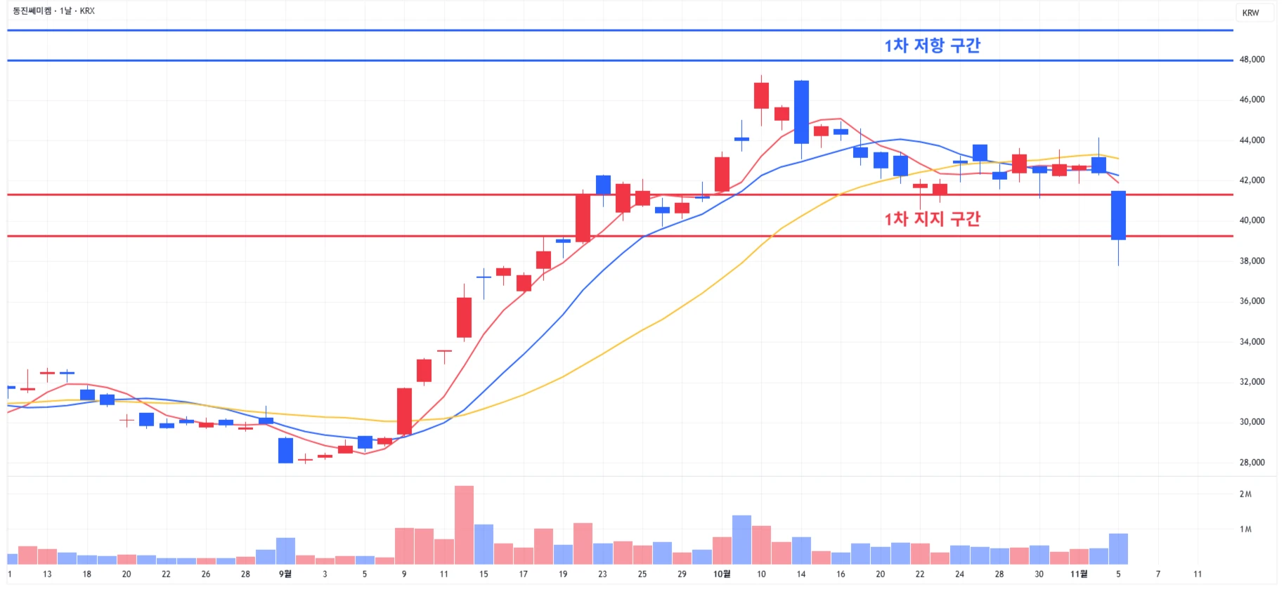 1) 동진쎄미켐 : 당일 시장 급락과 더불어, 3분기 실적 발표 결과가 기대치에 못미치며