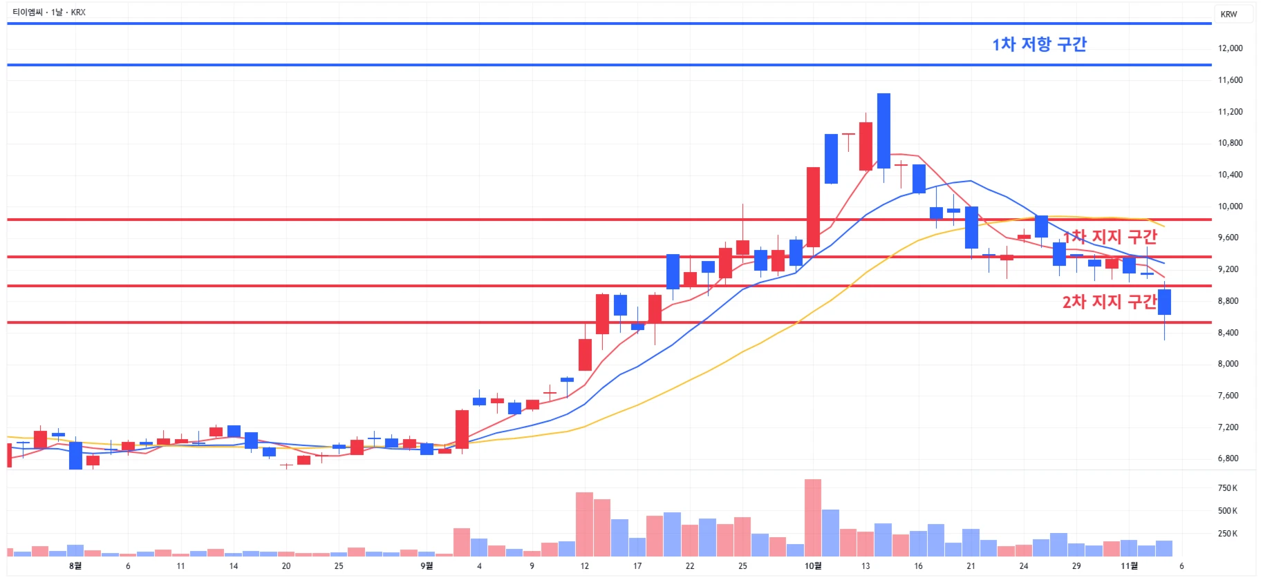 2) 티이엠씨 : 당일 시장 급락에 2차 지지 구간까지 하락하며 마무리