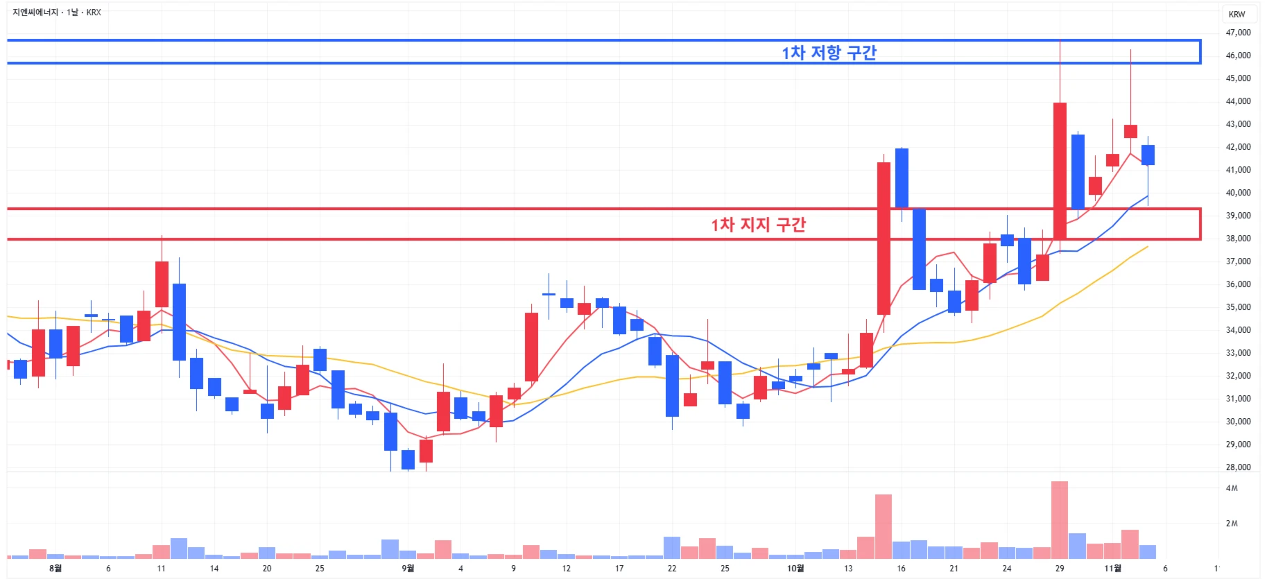 1) 지엔씨에너지 : 당일 1차 지지 구간 상단까지 하락하기도 했으나,