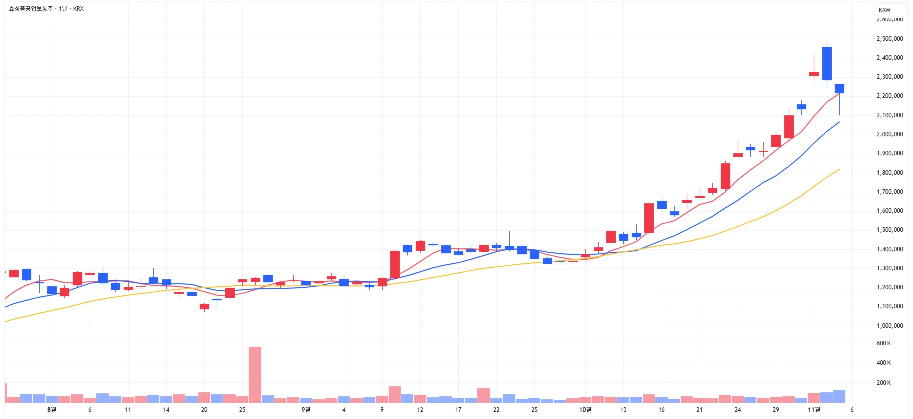 3) 효성중공업 : 전일에 이어 당일 시장 약세에 하락 마무리